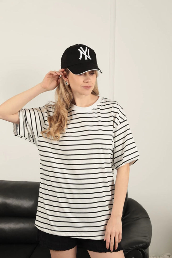 Süprem Kumaş Çizgili Sıfır Yaka Tişört-Siyah