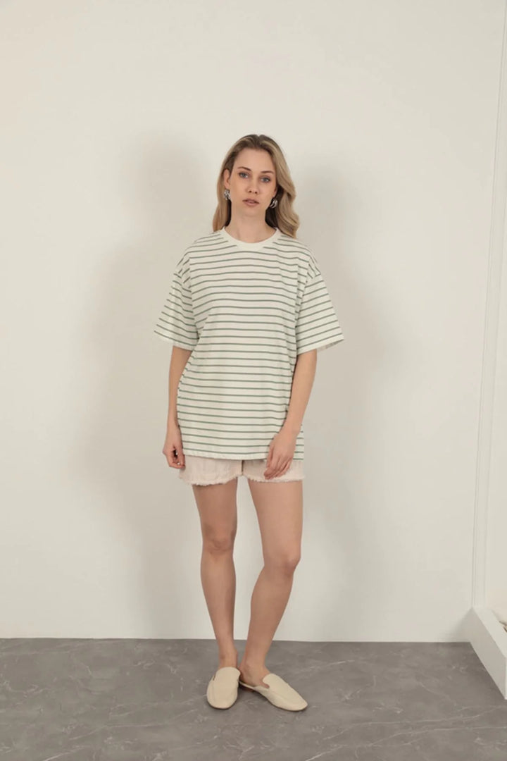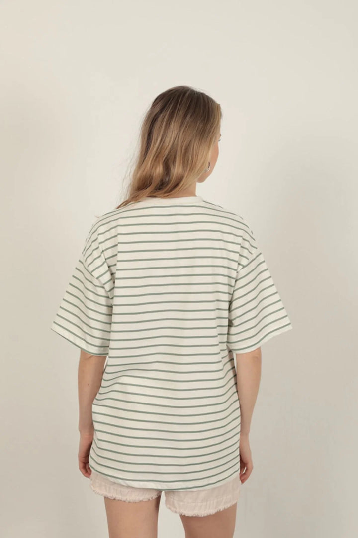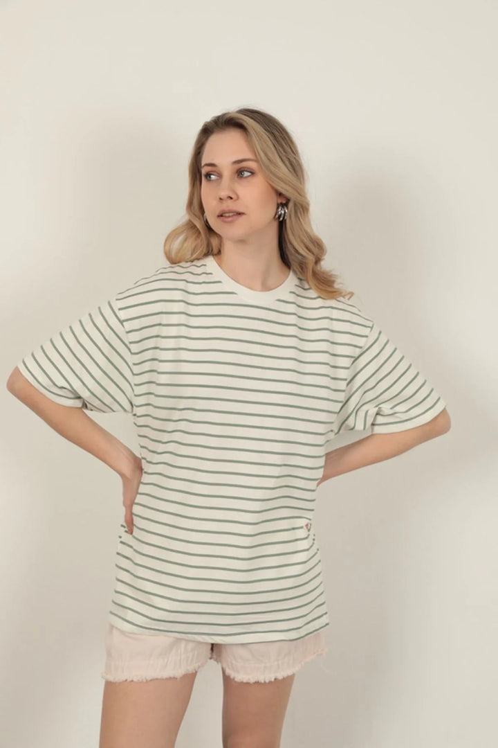 Süprem Kumaş Çizgili Sıfır Yaka Tişört-Yeşil
