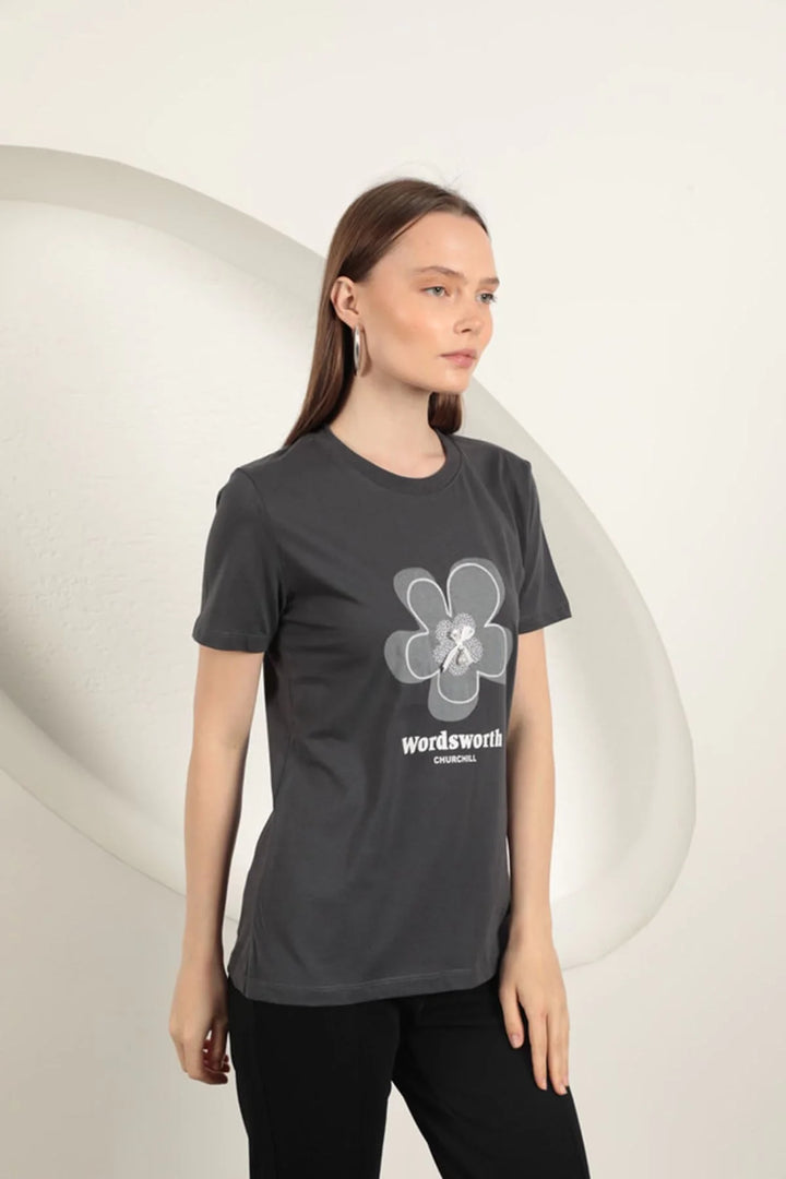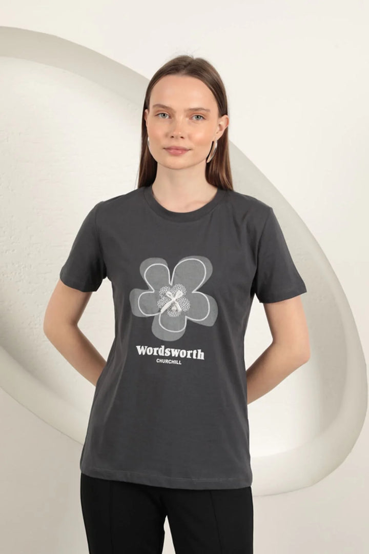 Süprem Kumaş Fiyonk Baskılı Tişört-Antrasit