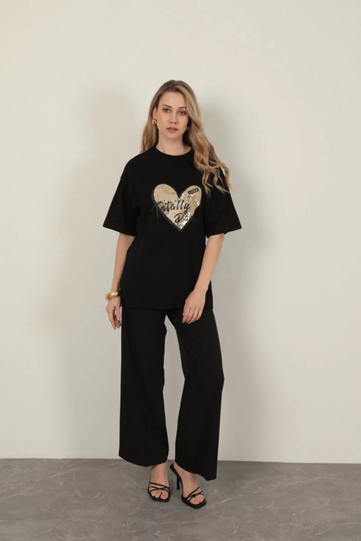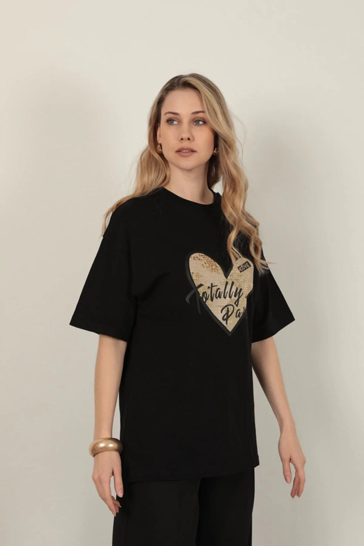Süprem Kumaş Pul Detaylı Kadın Tişört-Siyah