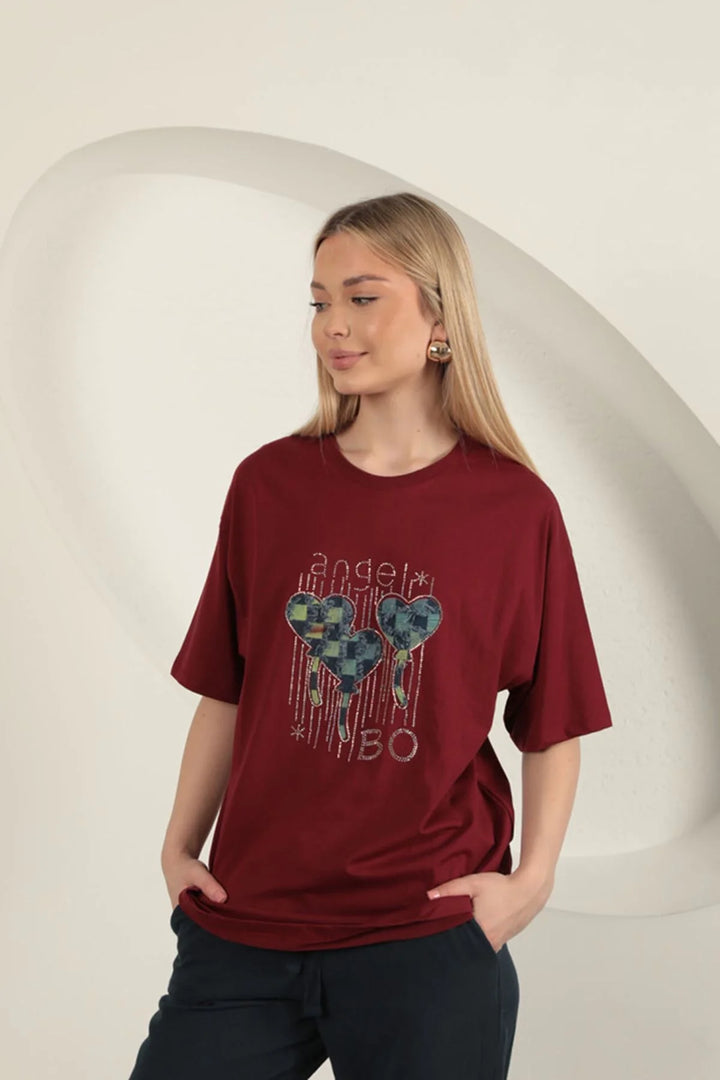 Süprem Kumaş Taş Baskılı Kadın Tişört-Bordo