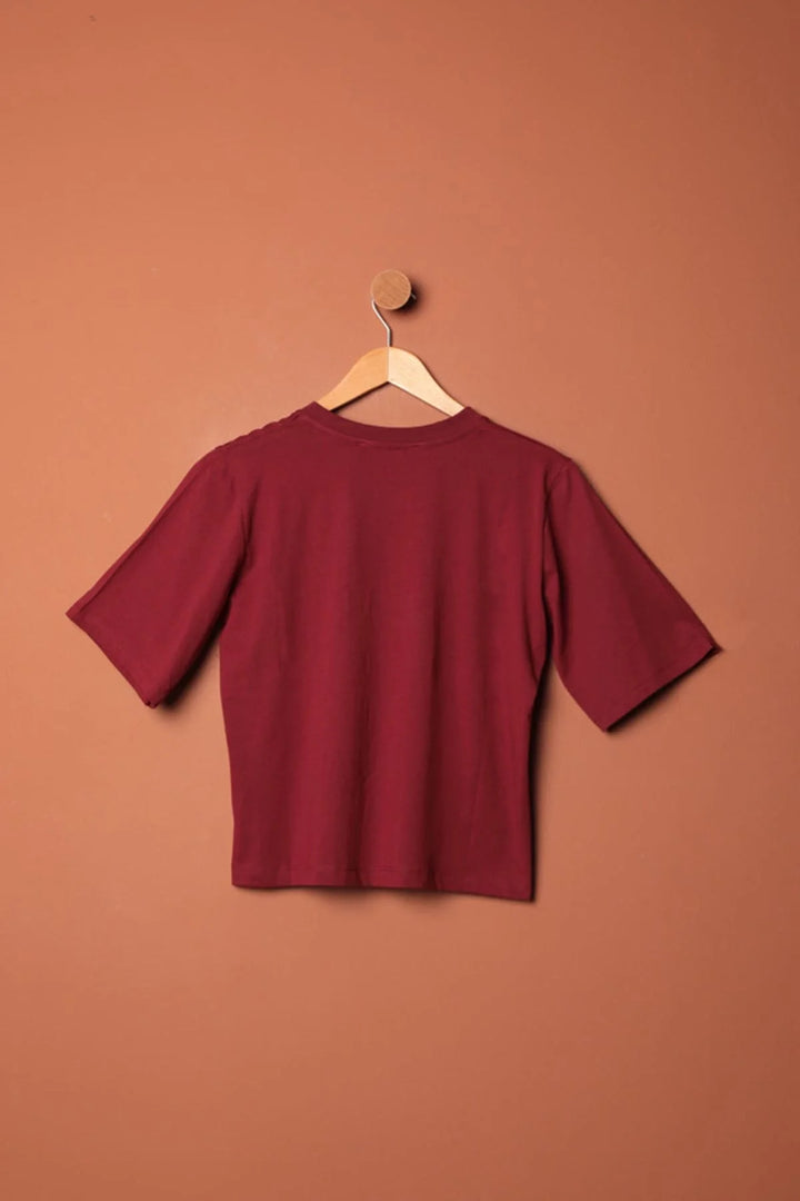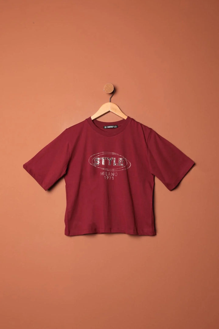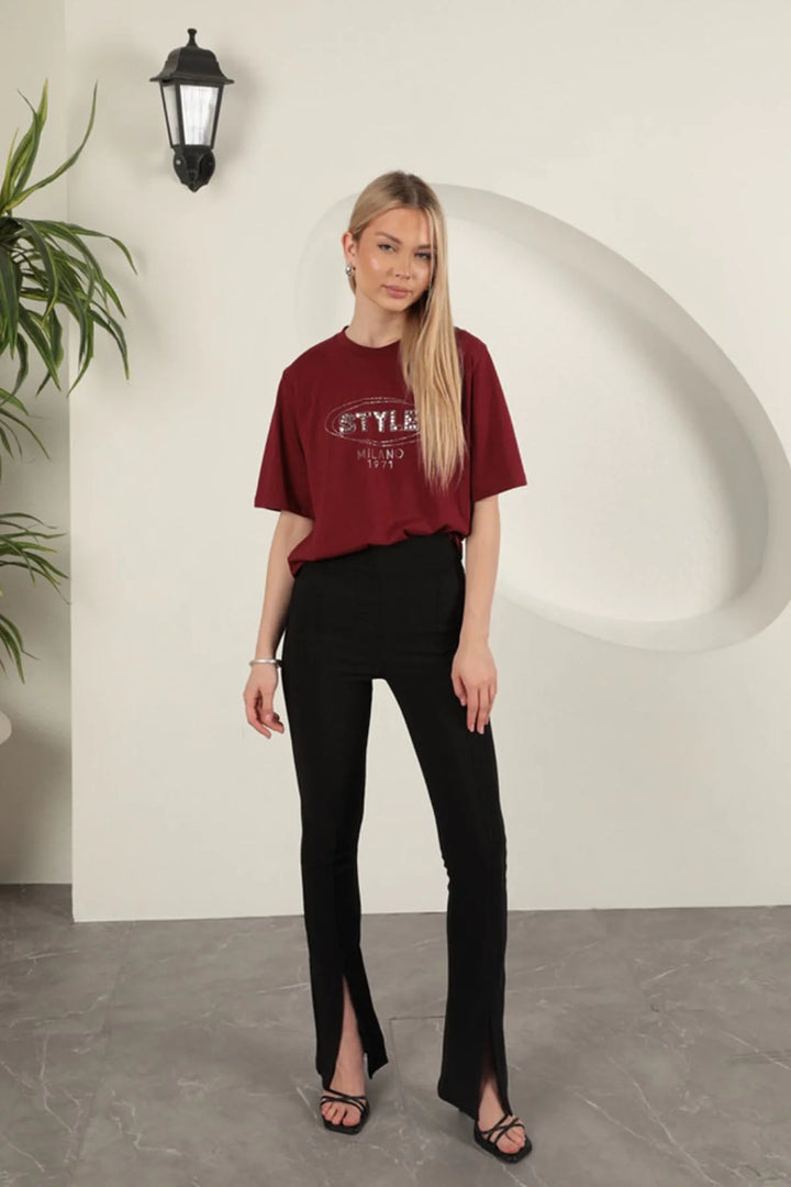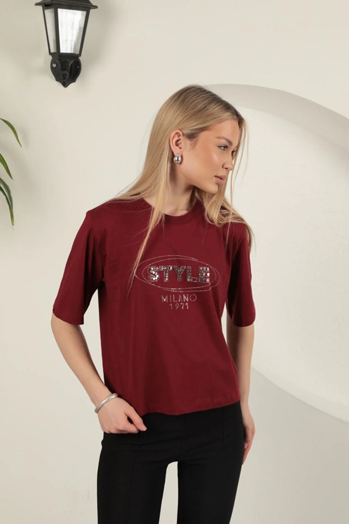 Süprem Kumaş Taş Detaylı Kadın Tişört-Bordo