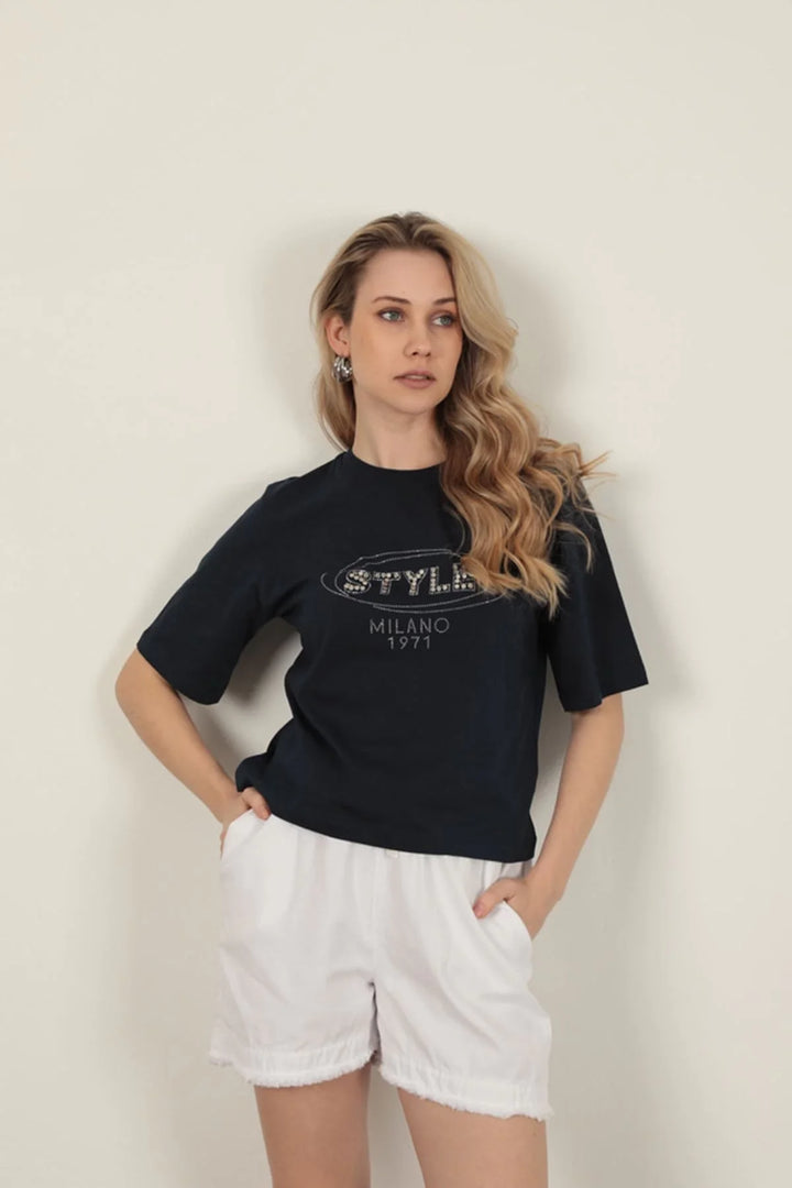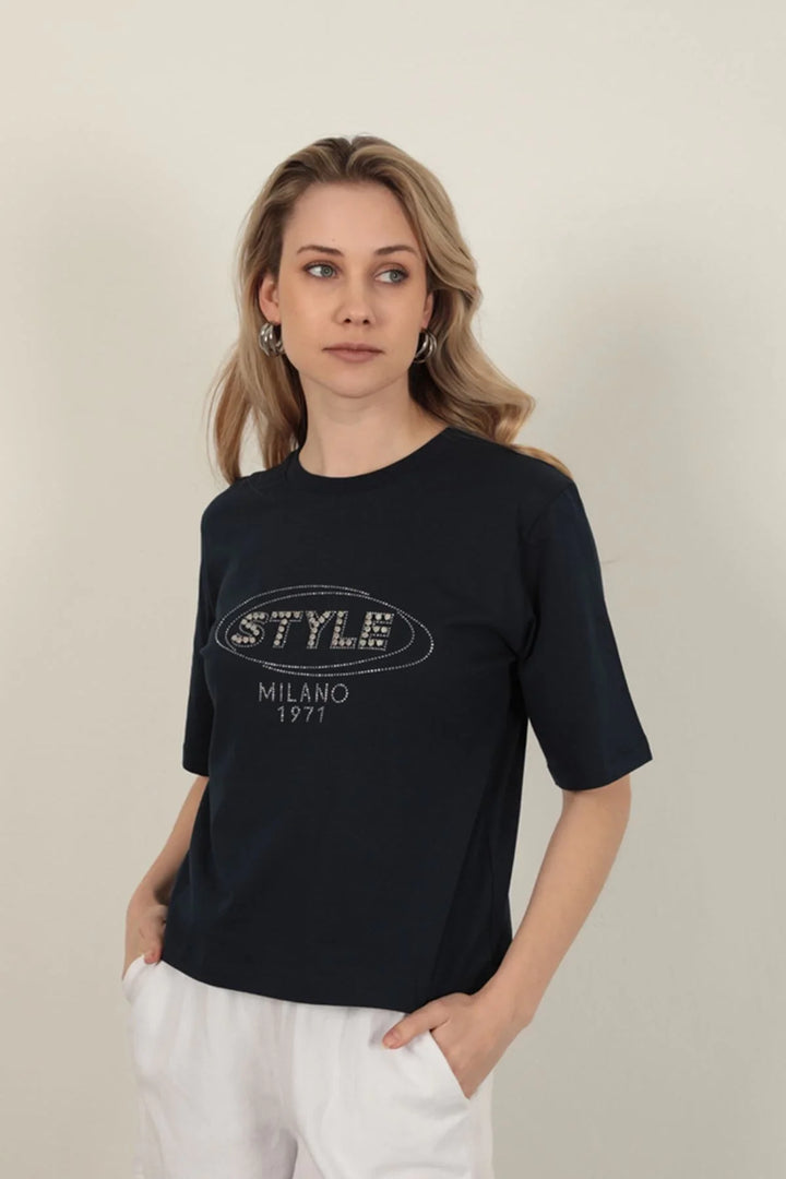 Süprem Kumaş Taş Detaylı Kadın Tişört-Lacivert