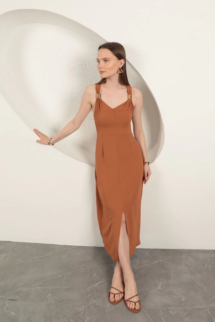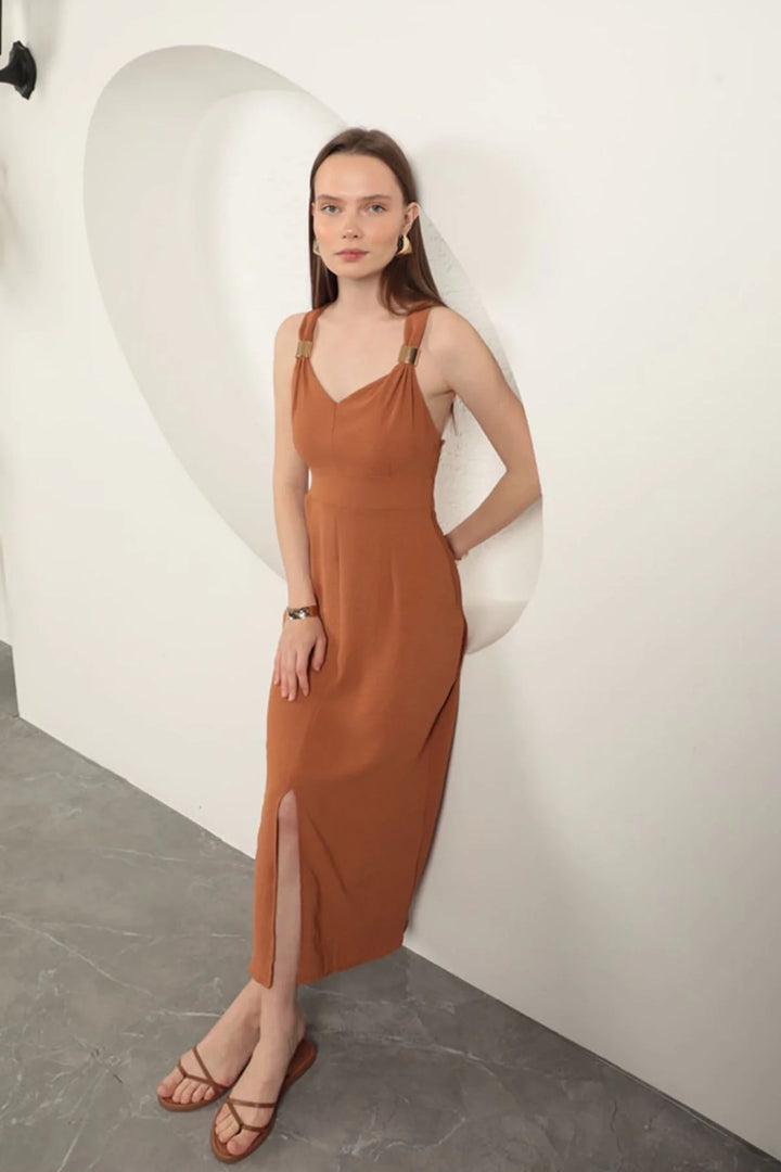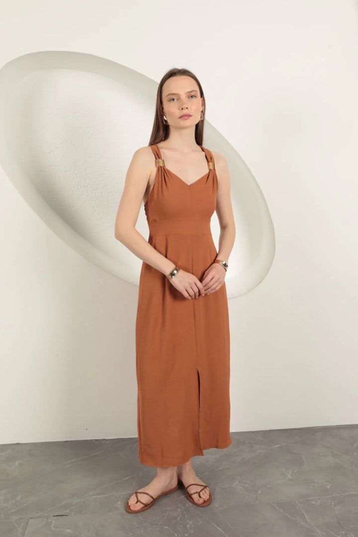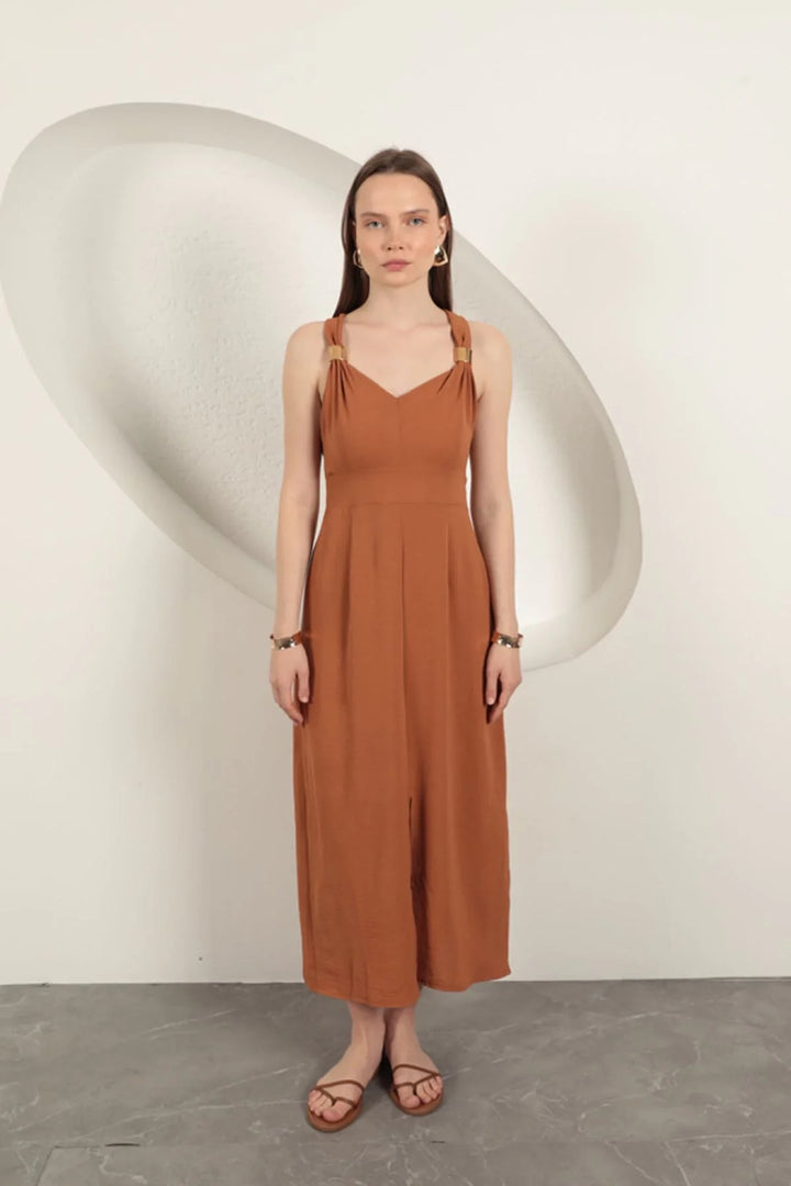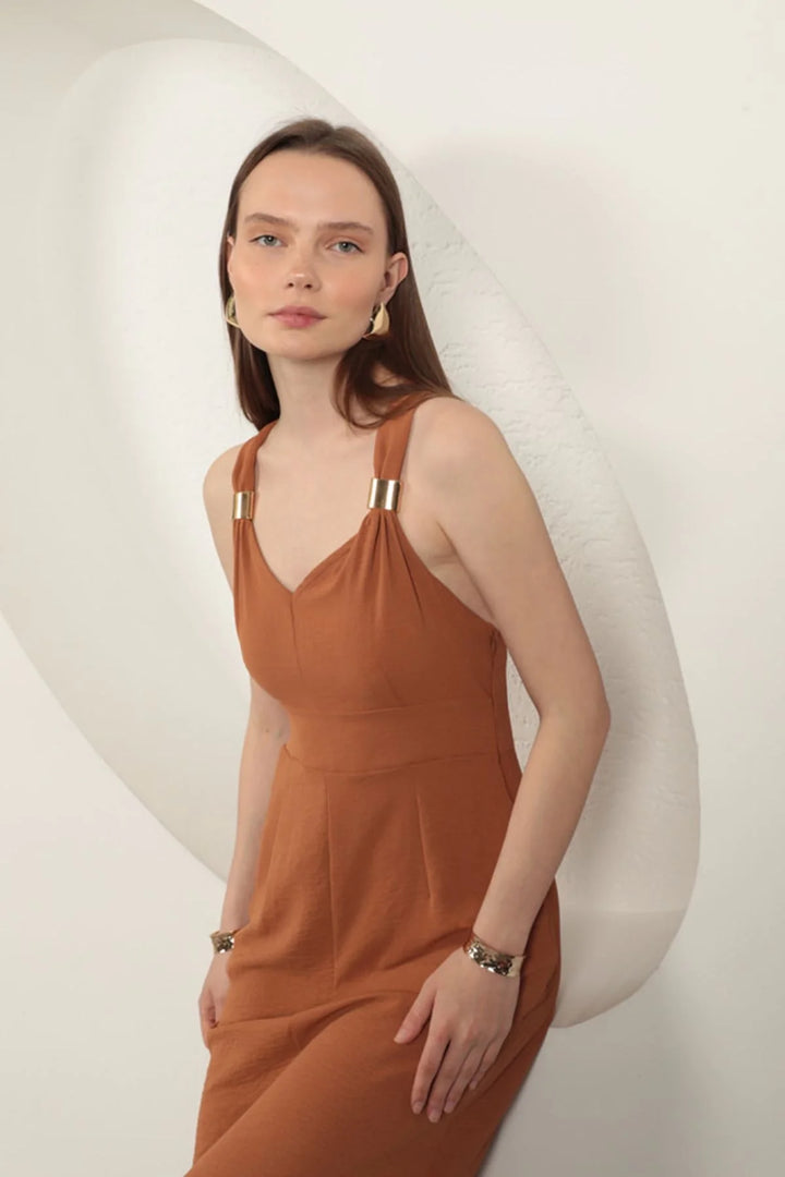 Toka Detaylı Askılı Elbise-Kahve