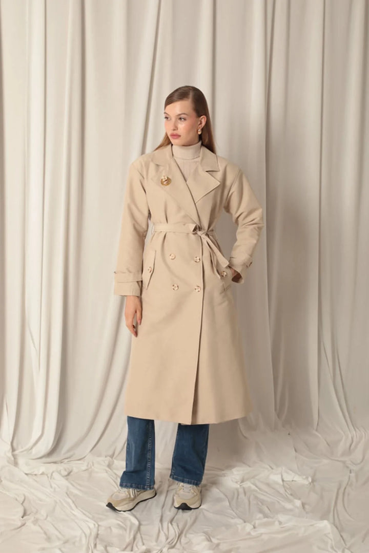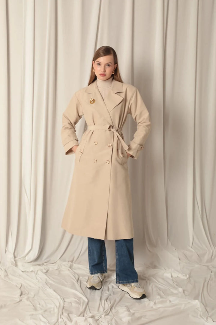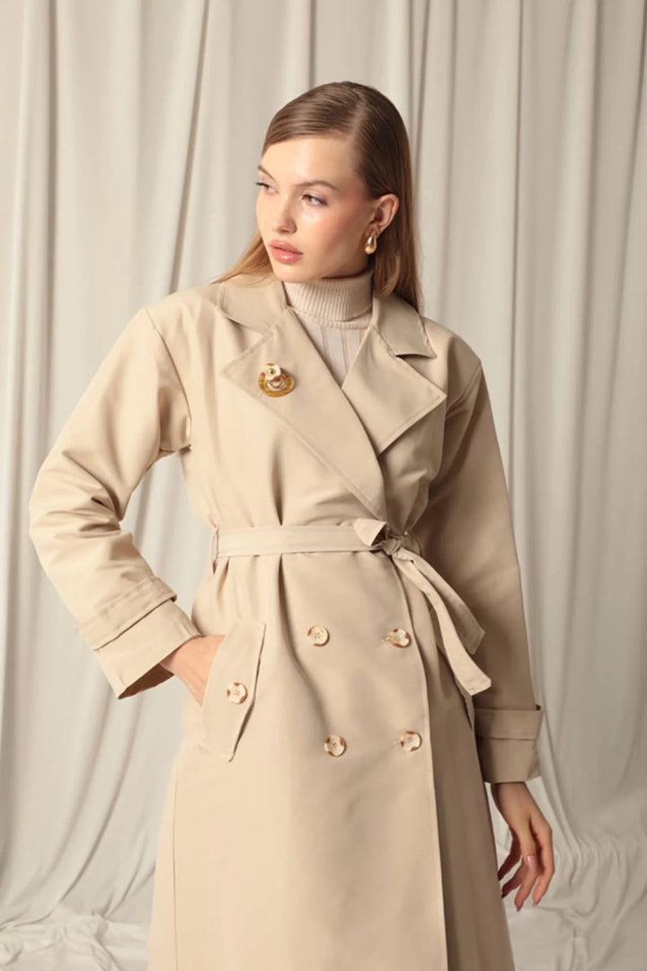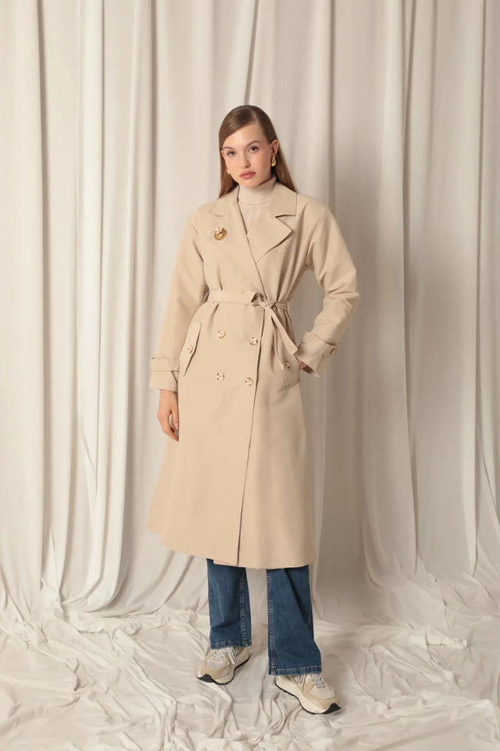 Torino Kumaş Broşlu Maxi Boy Kadın Taş Trençkot