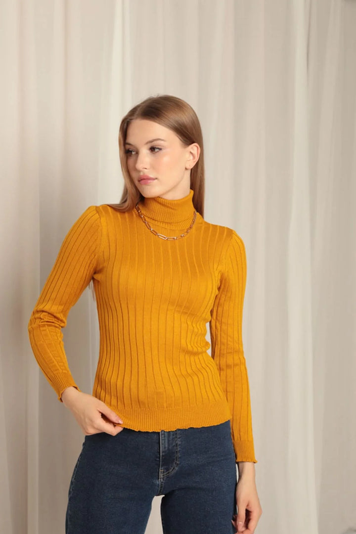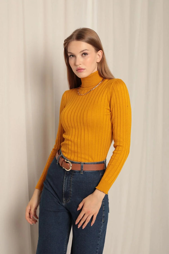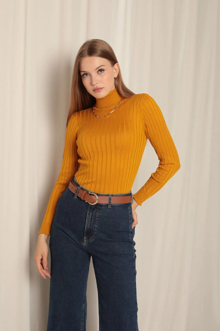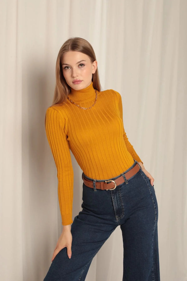 Triko Kumaş Balıkçı Yaka Kadın Hardal Bluz
