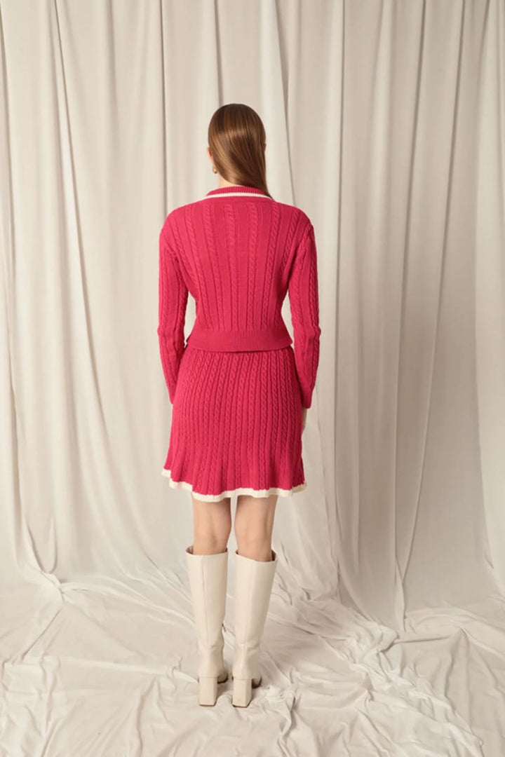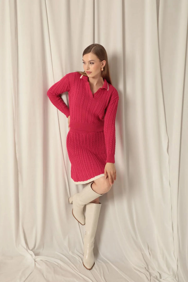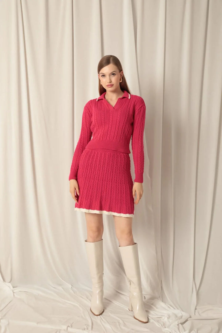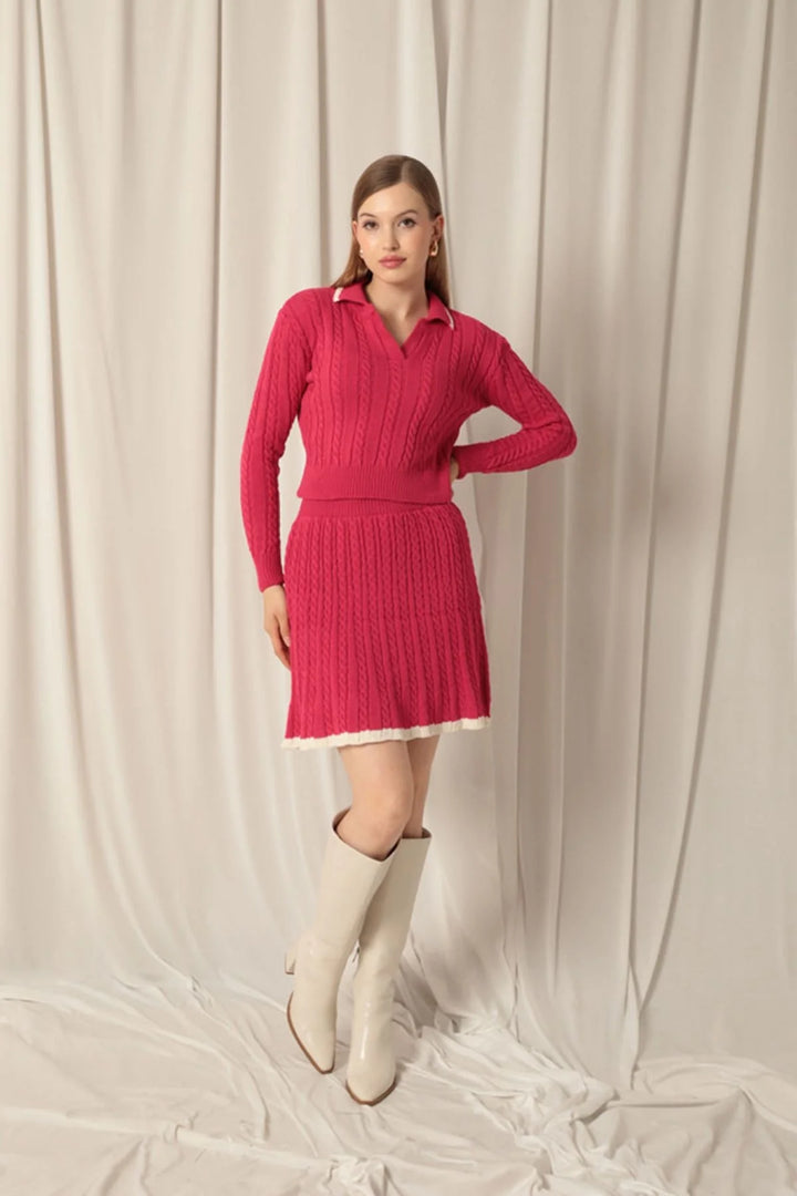 Triko Kumaş Yakalı Saç Örgülü Desen Fuşya Etek Takım