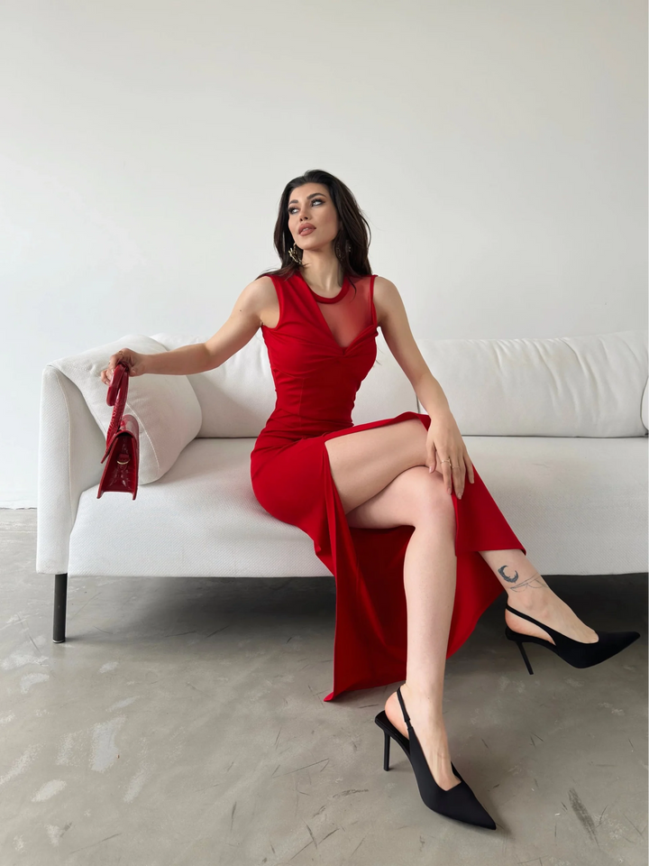 Tül Detaylı Derin Yırtmaçlı Elbise