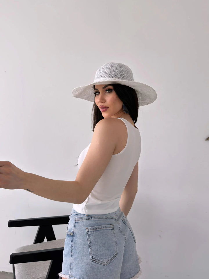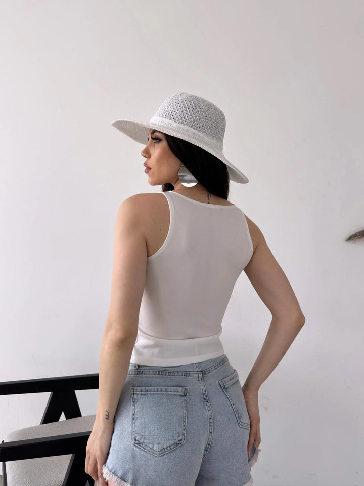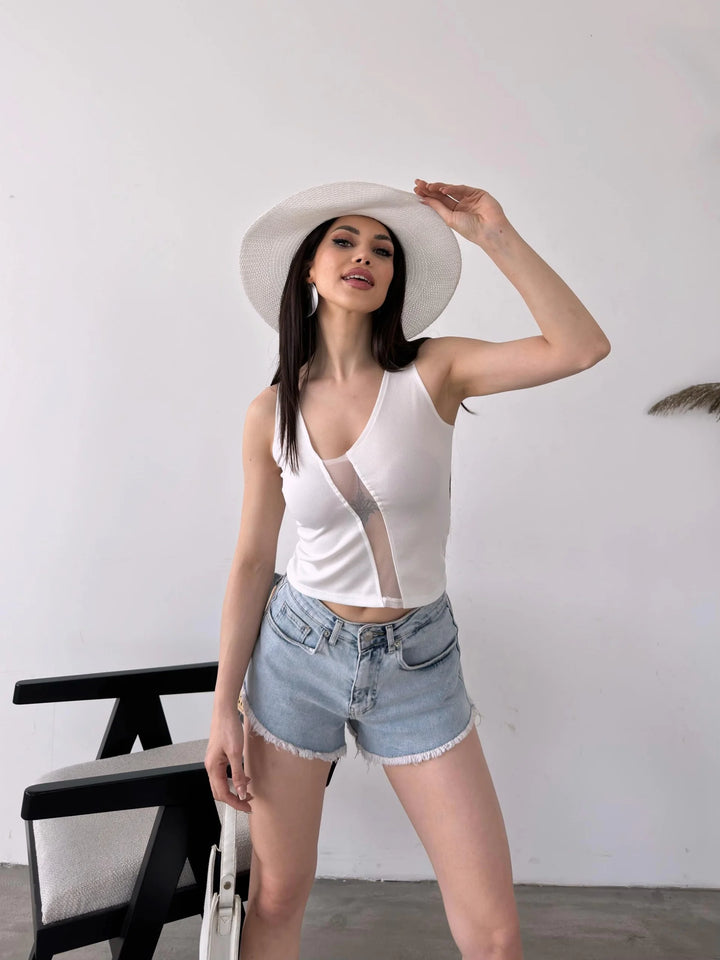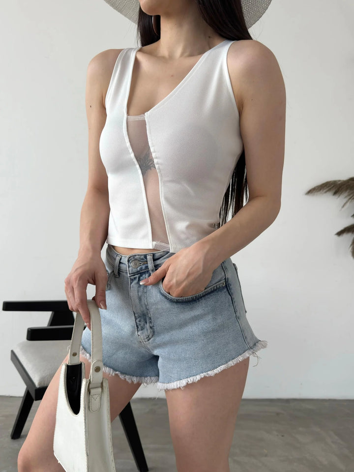 Tül Detaylı Göğüs Dekolteli Kolsuz Bluz