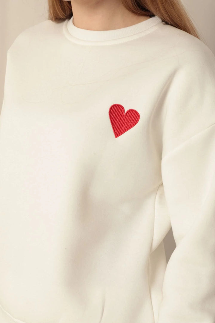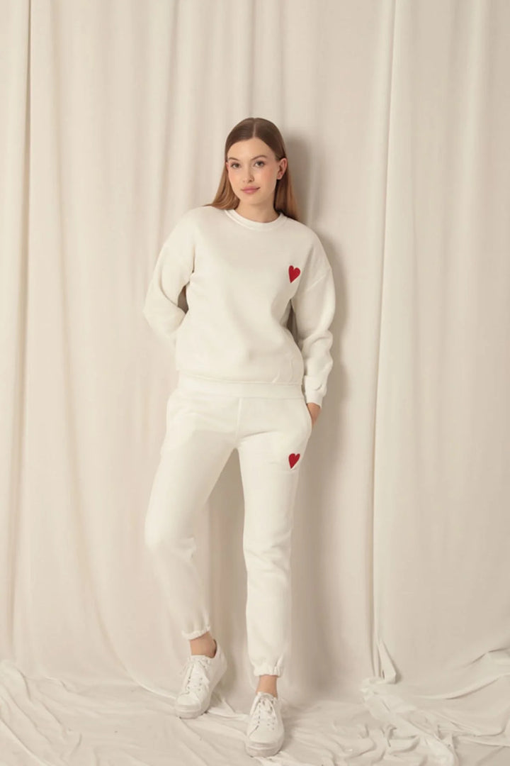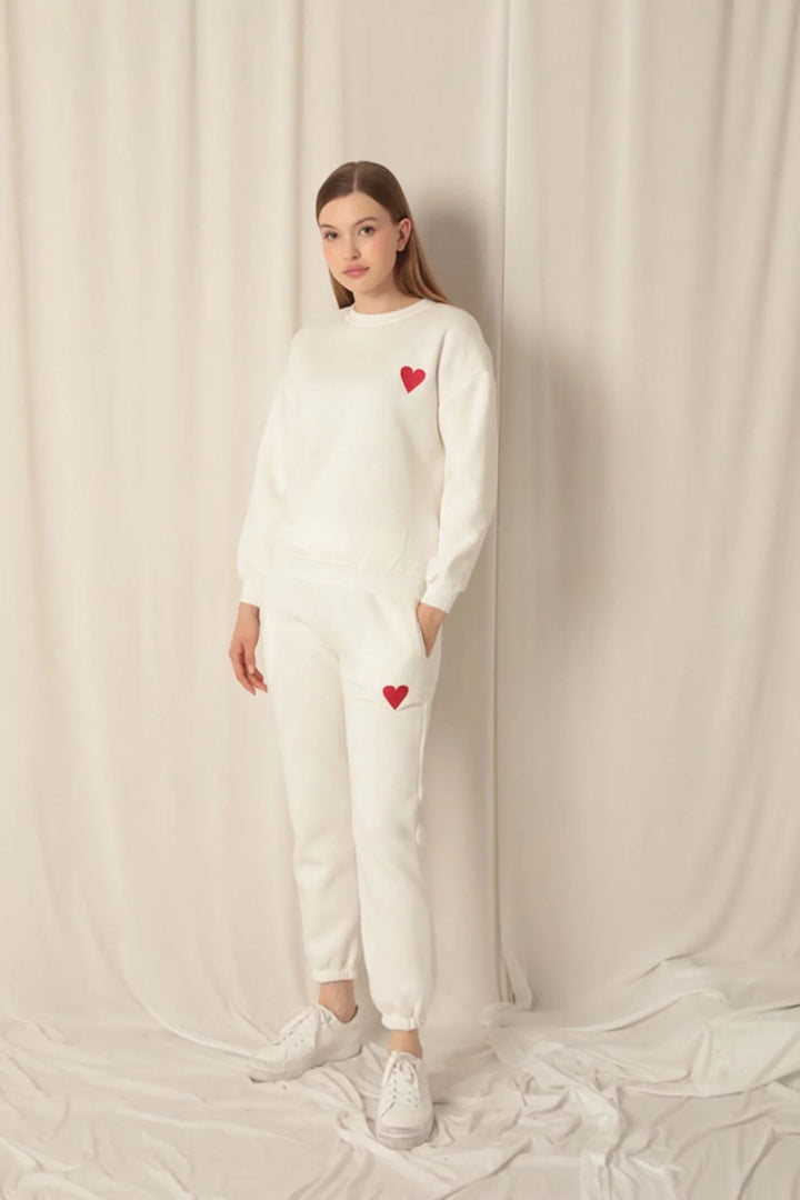 Üç İplik Kumaş Kalp Nakışlı Kadın Ekru Takım
