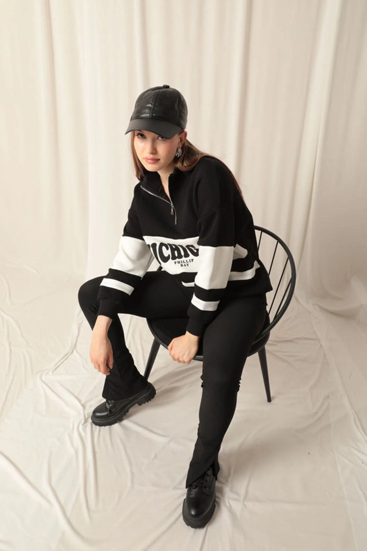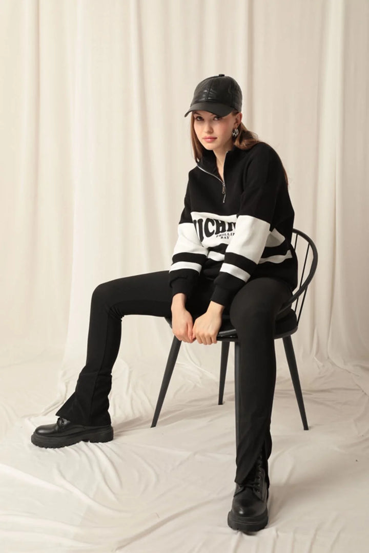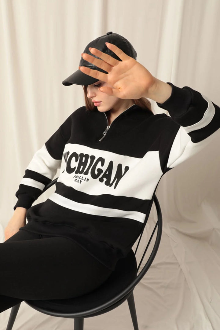 Üç İplik Michigan Baskılı Fermuarlı Kadın Siyah Sweat