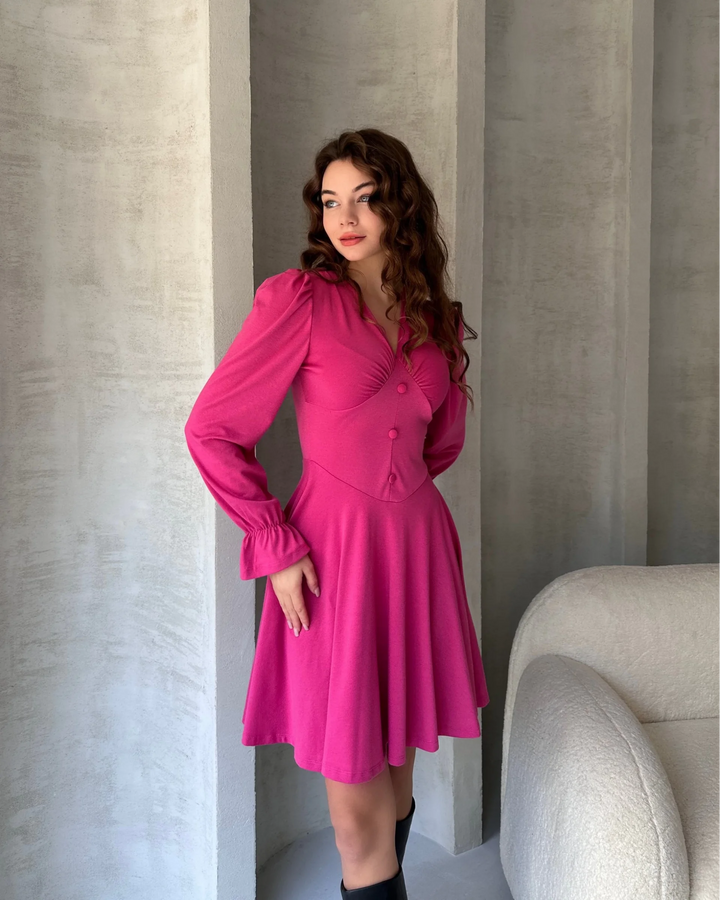 V Yaka Düğme Detaylı Mini Crep Elbise