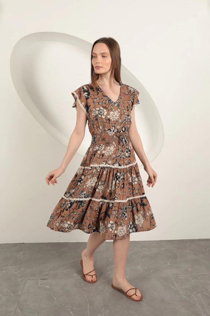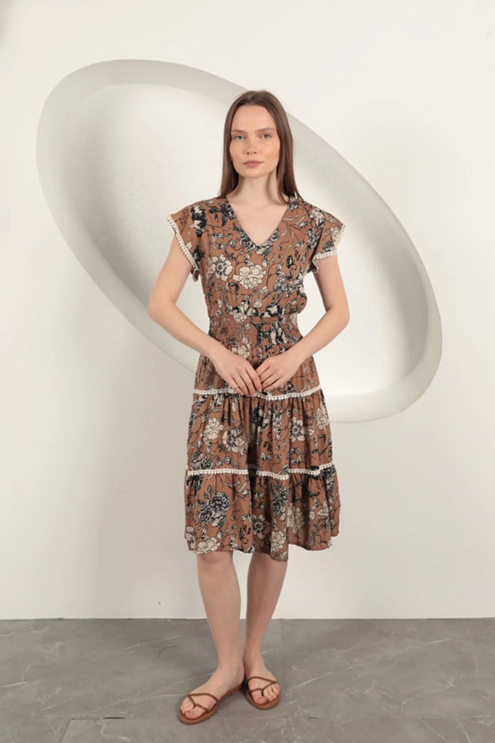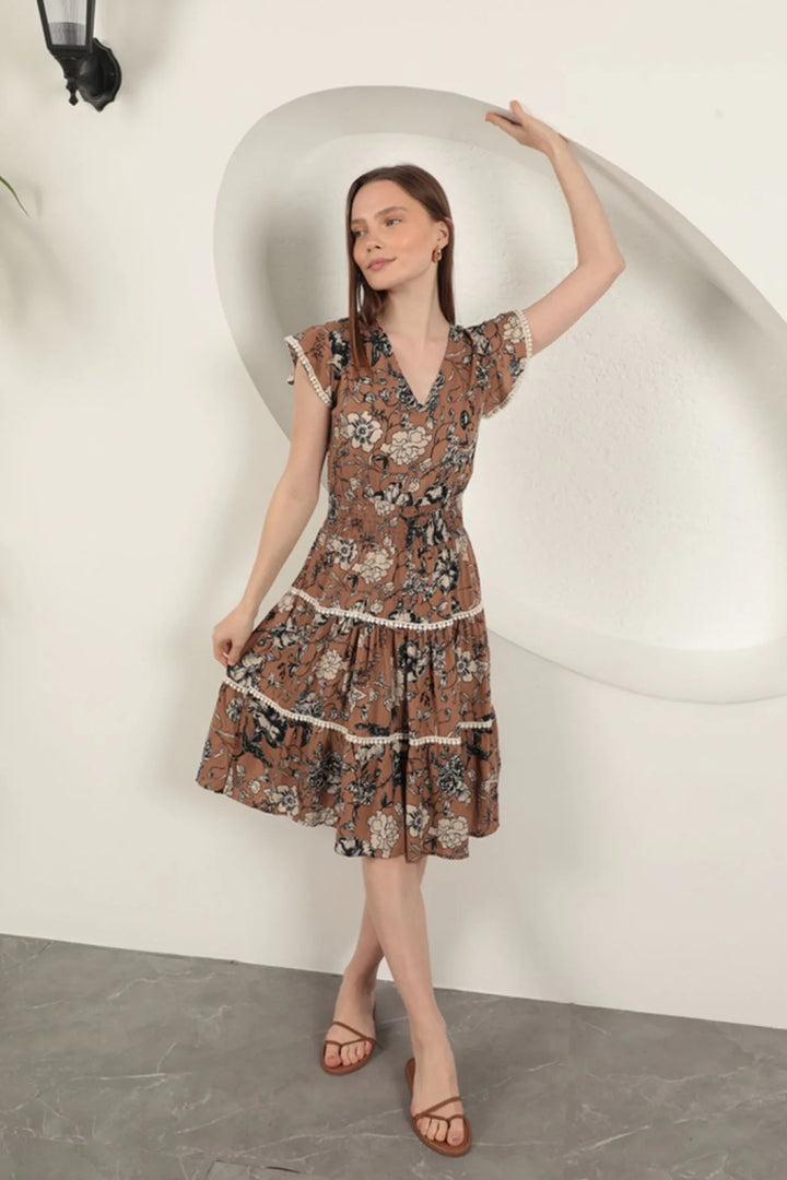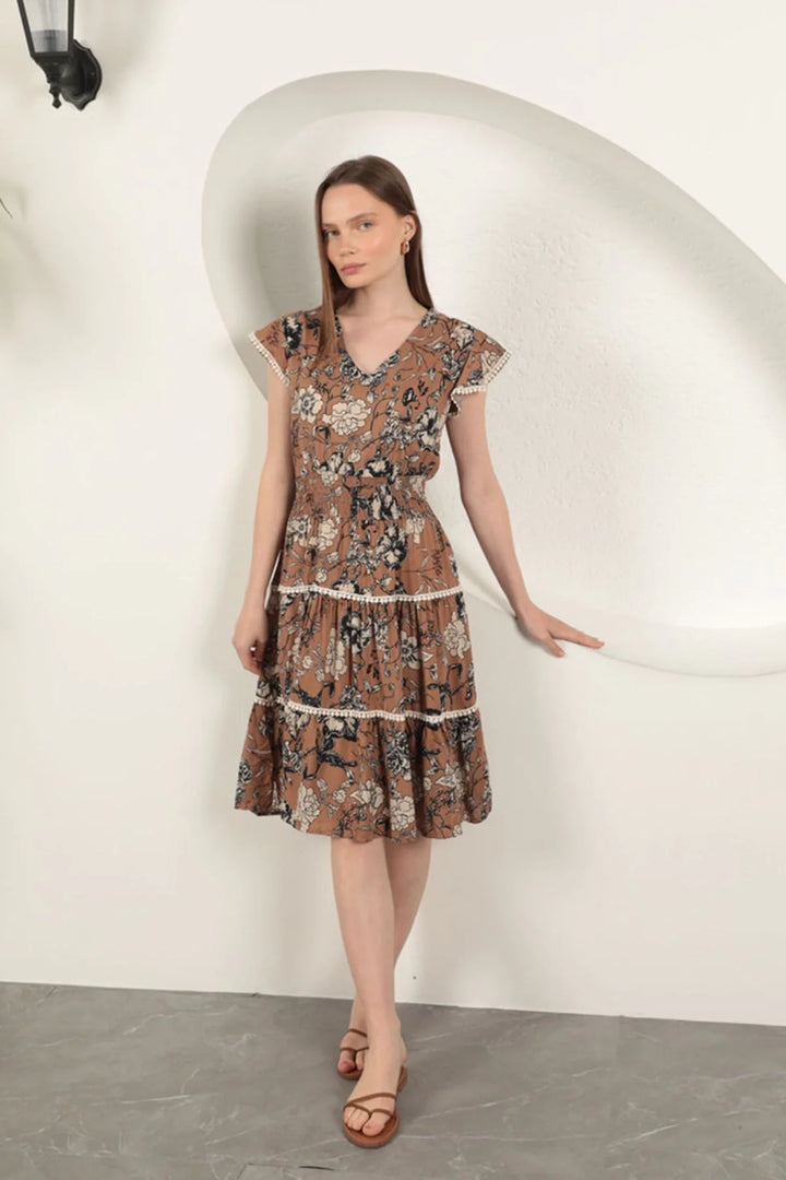 Viskon Çiçek Desenli Elbise-Kahve