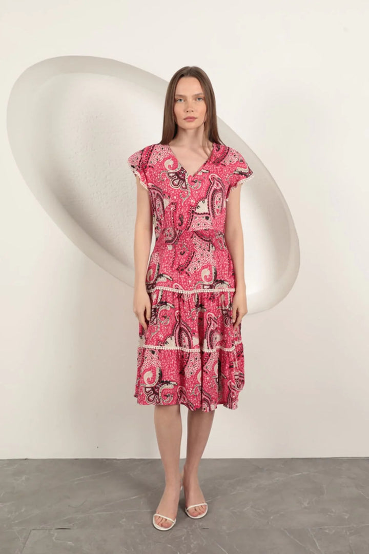 Viskon Etnik Desenli Elbise-Fuşya