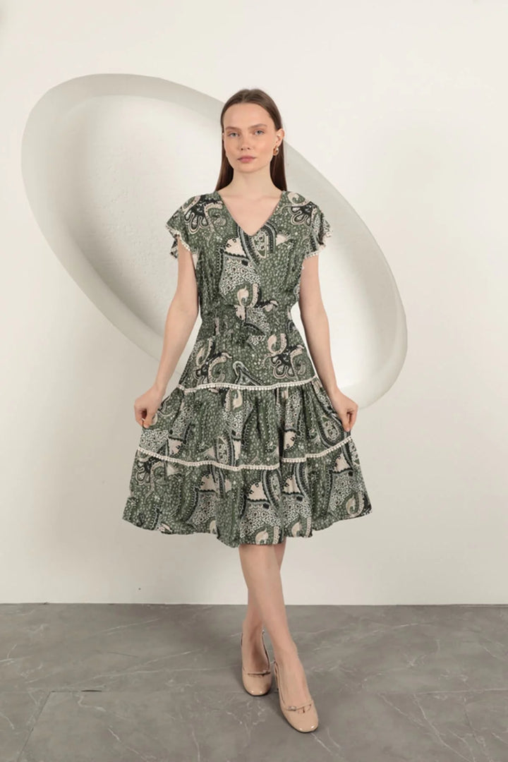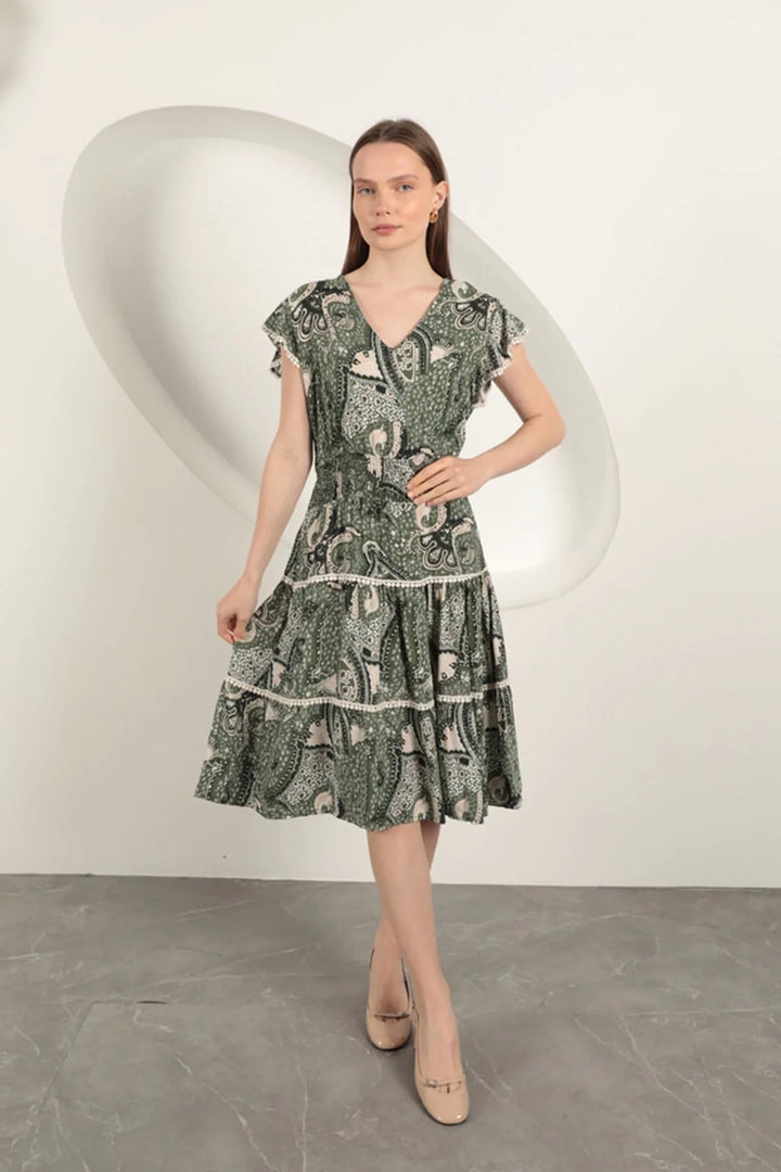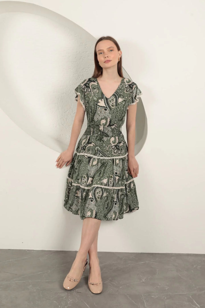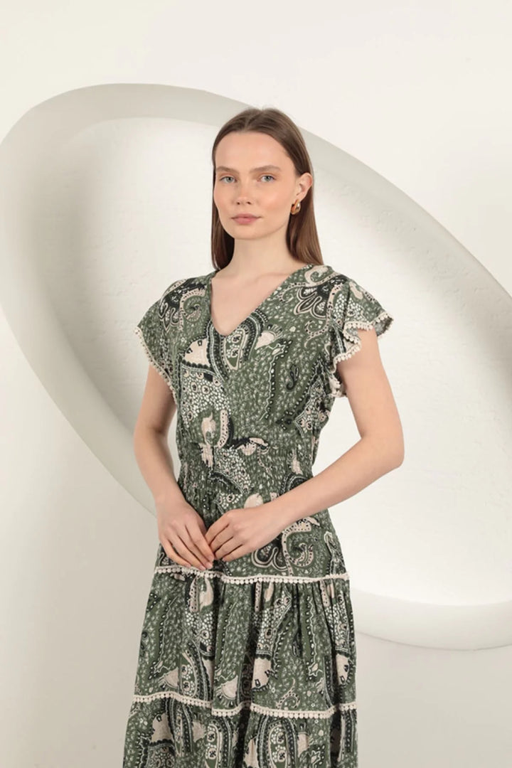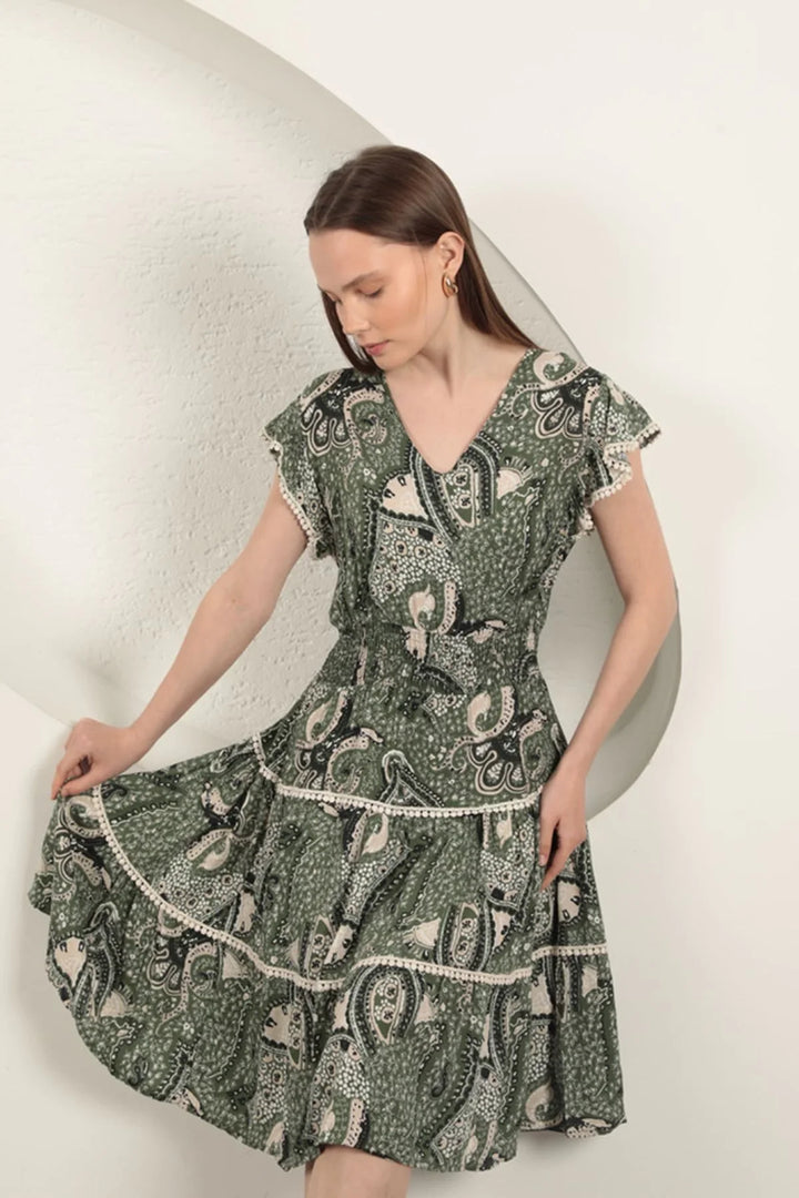 Viskon Etnik Desenli Elbise-Yeşil