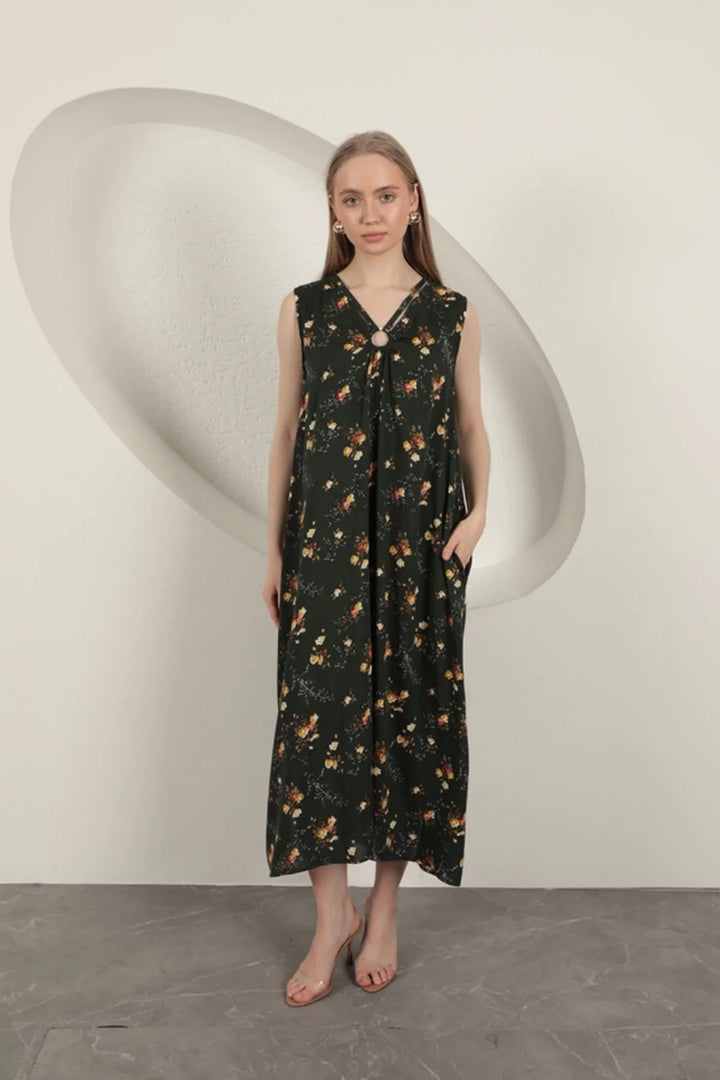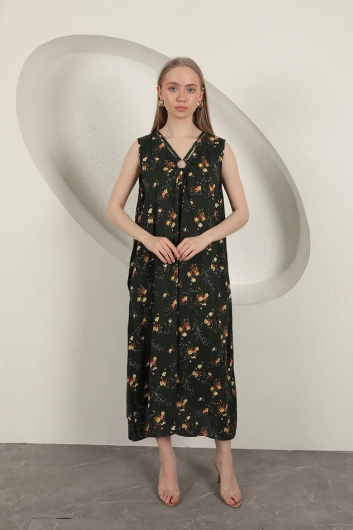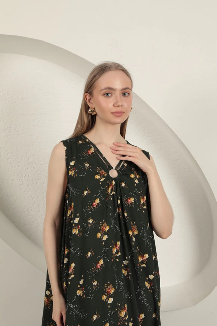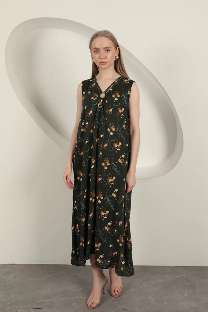 Viskon Kumaş Çiçek Desenli Elbise-Haki