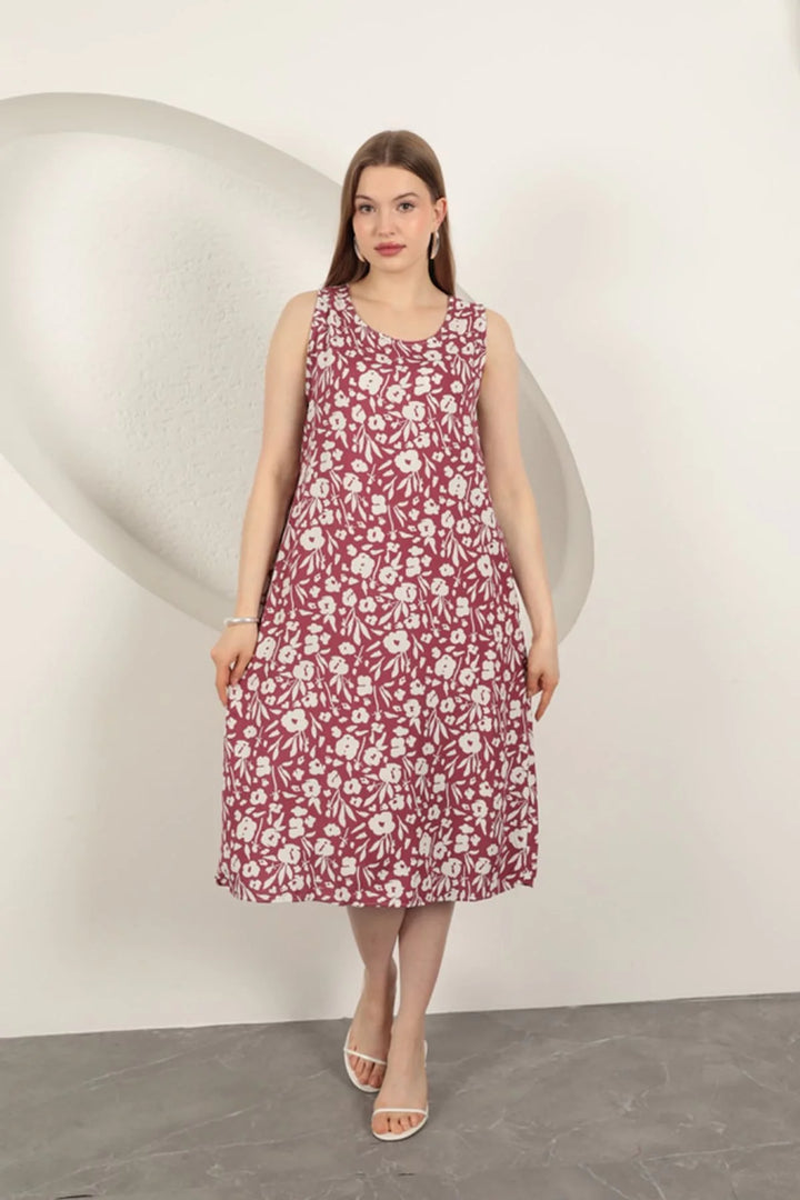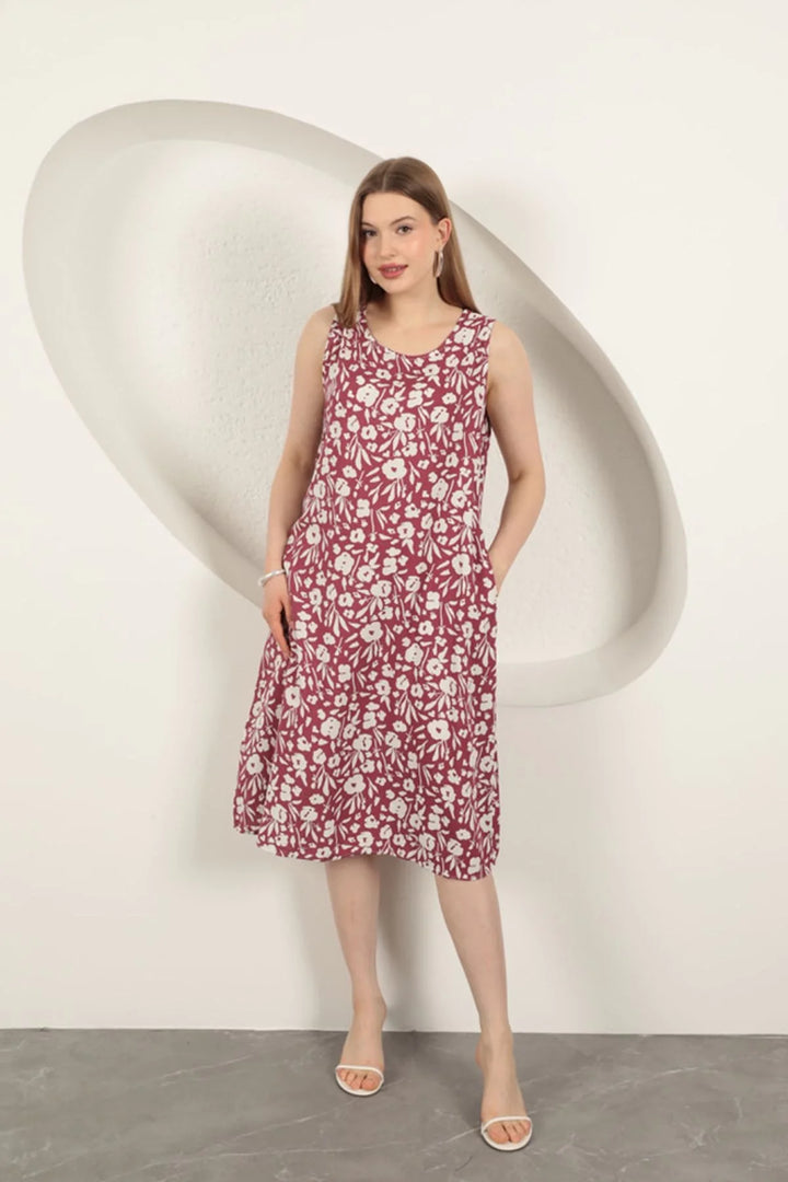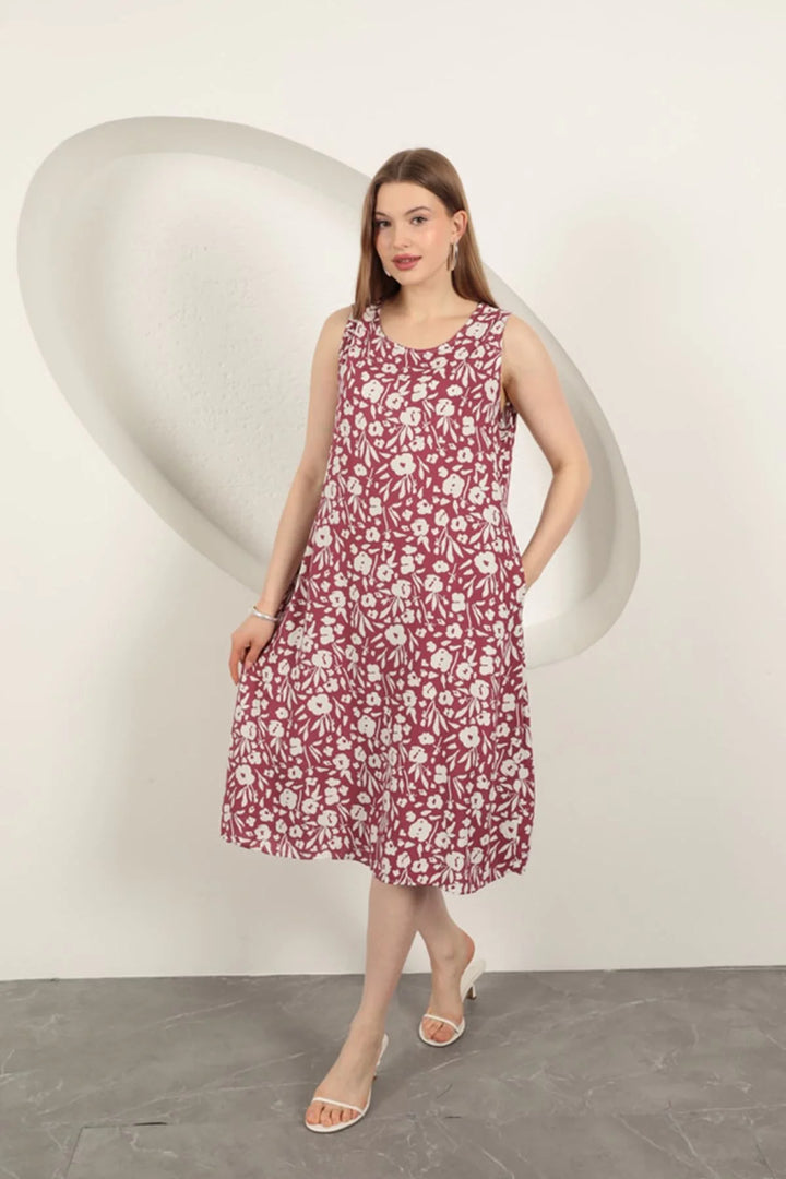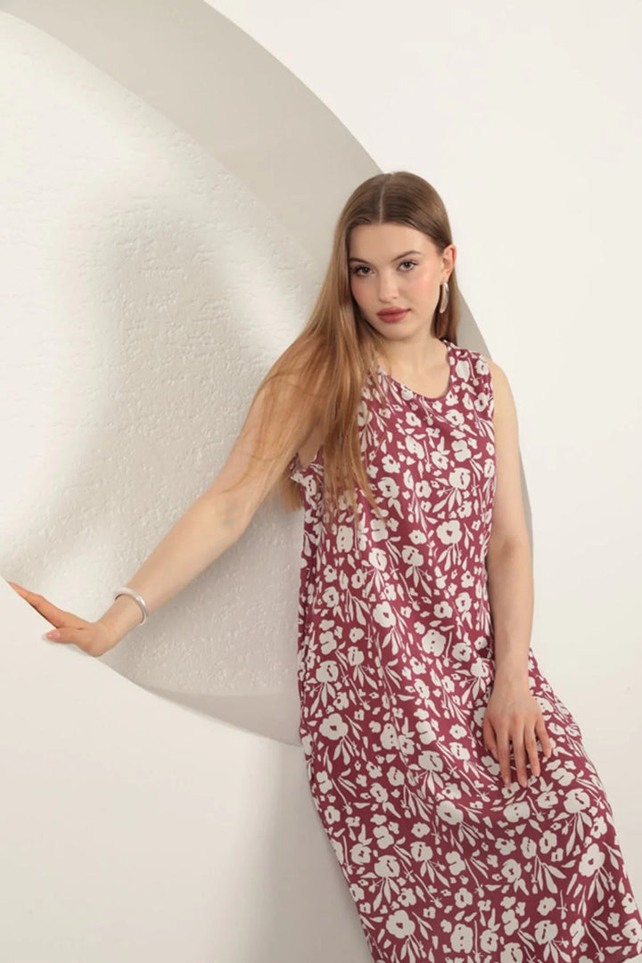 Viskon Kumaş Çiçek Desenli Elbise-Mor