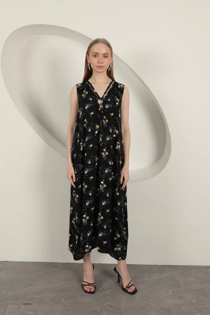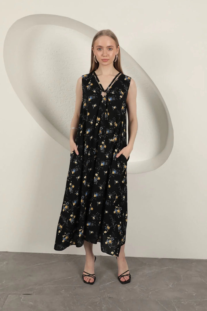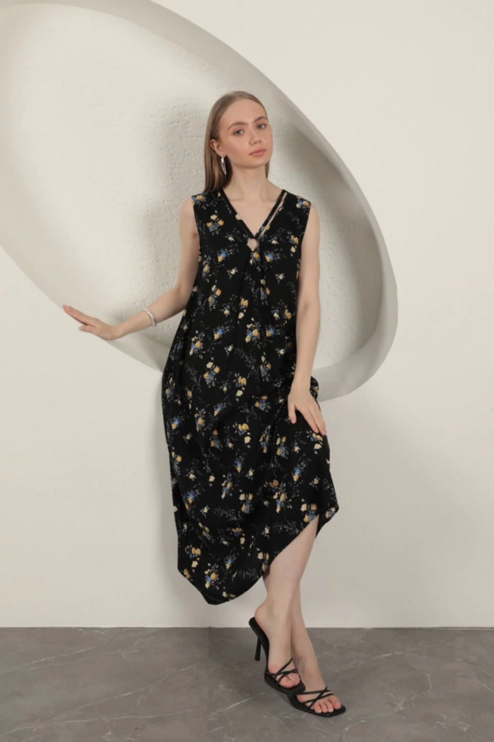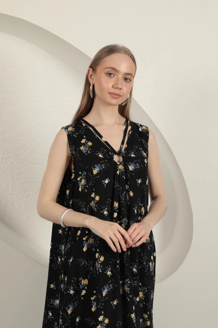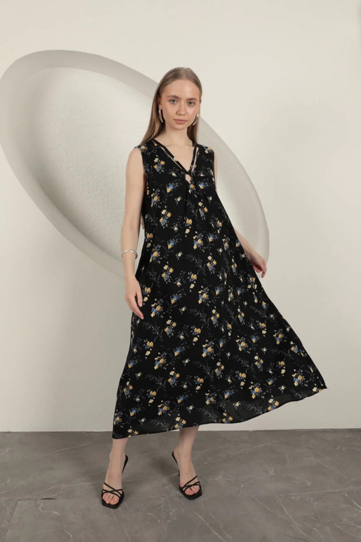 Viskon Kumaş Çiçek Desenli Elbise-Siyah