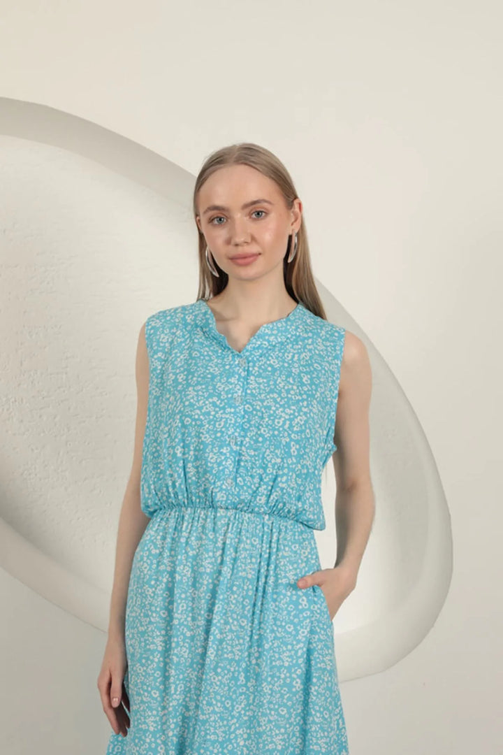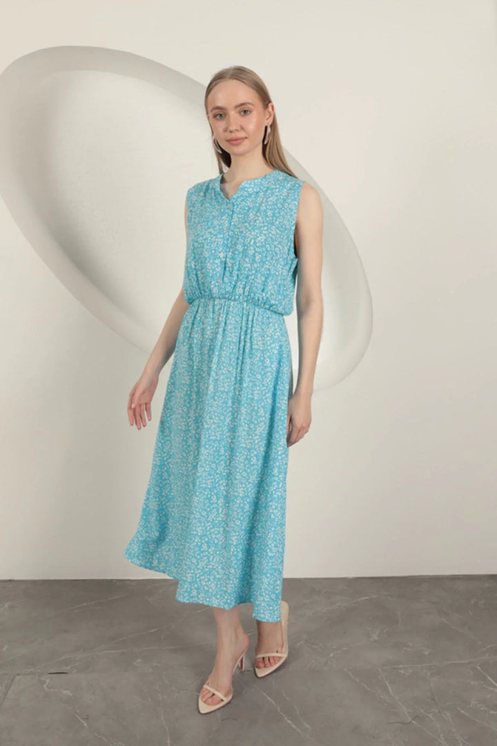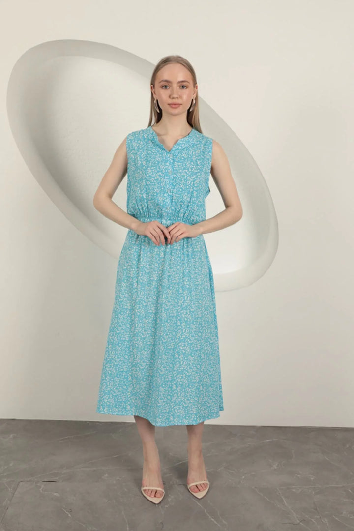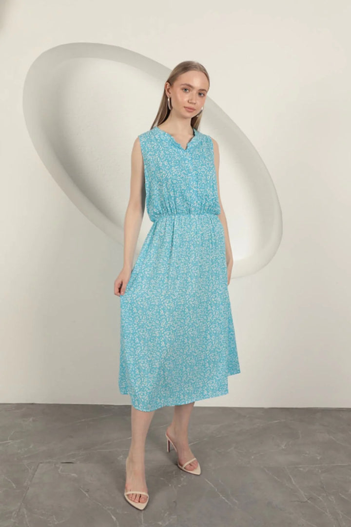 Viskon Kumaş Çıtır Desenli Elbise-Mavi