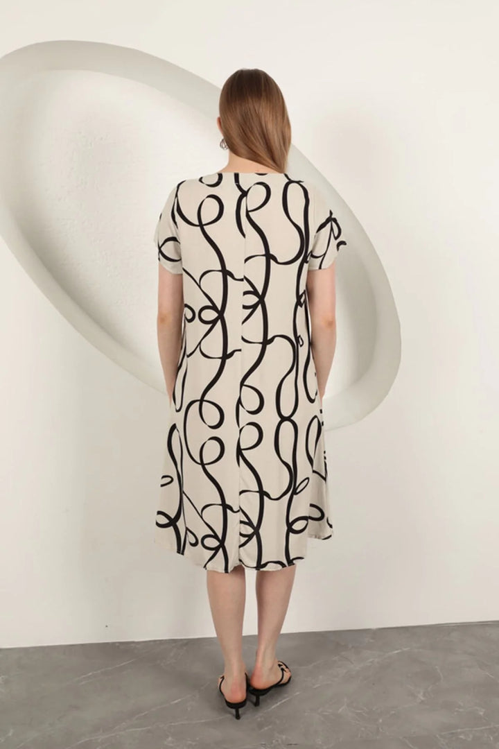 Viskon Kumaş Çizgi Desenli Elbise-Ekru