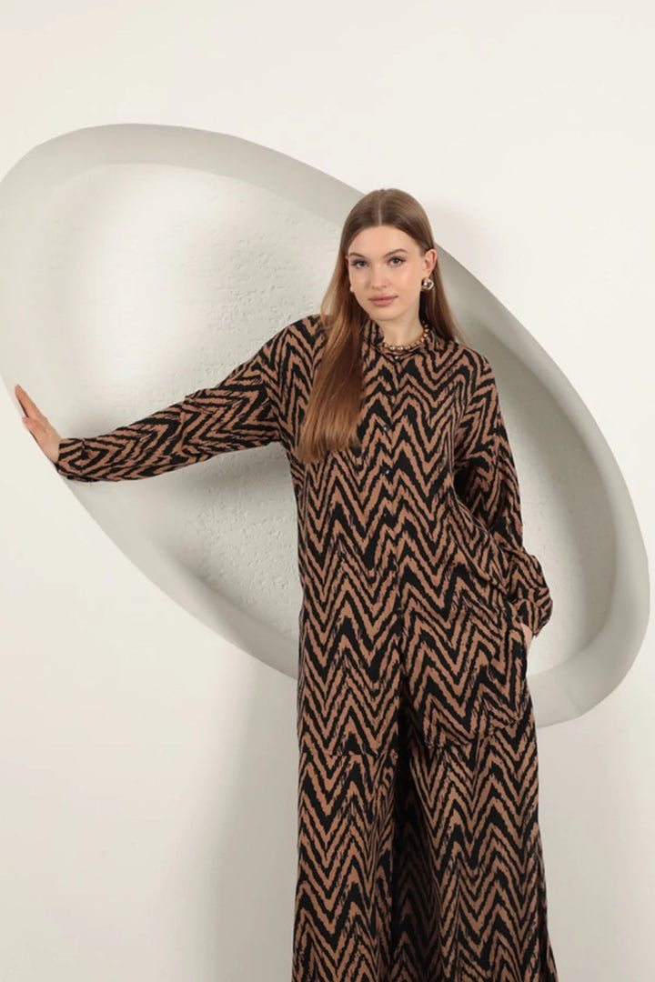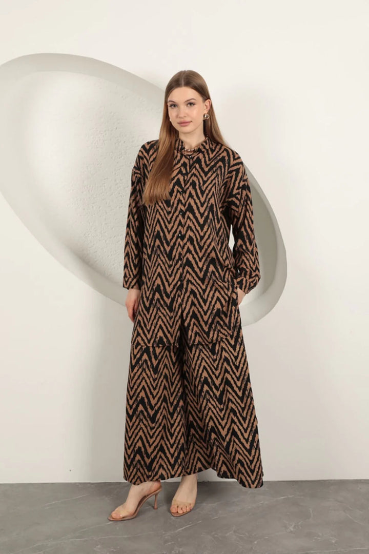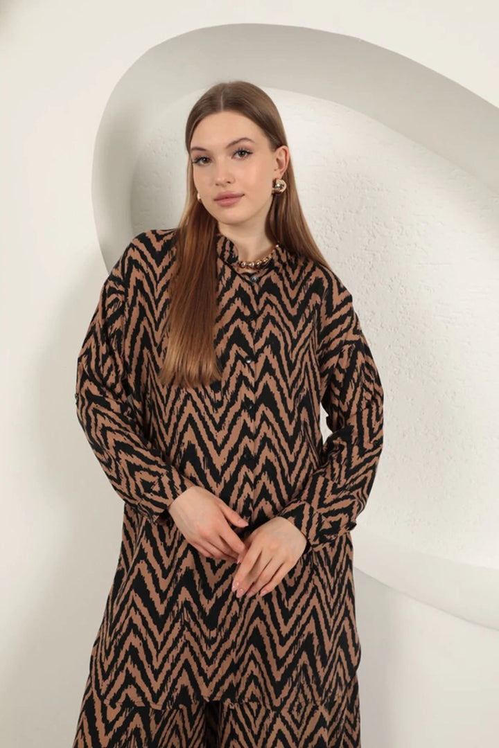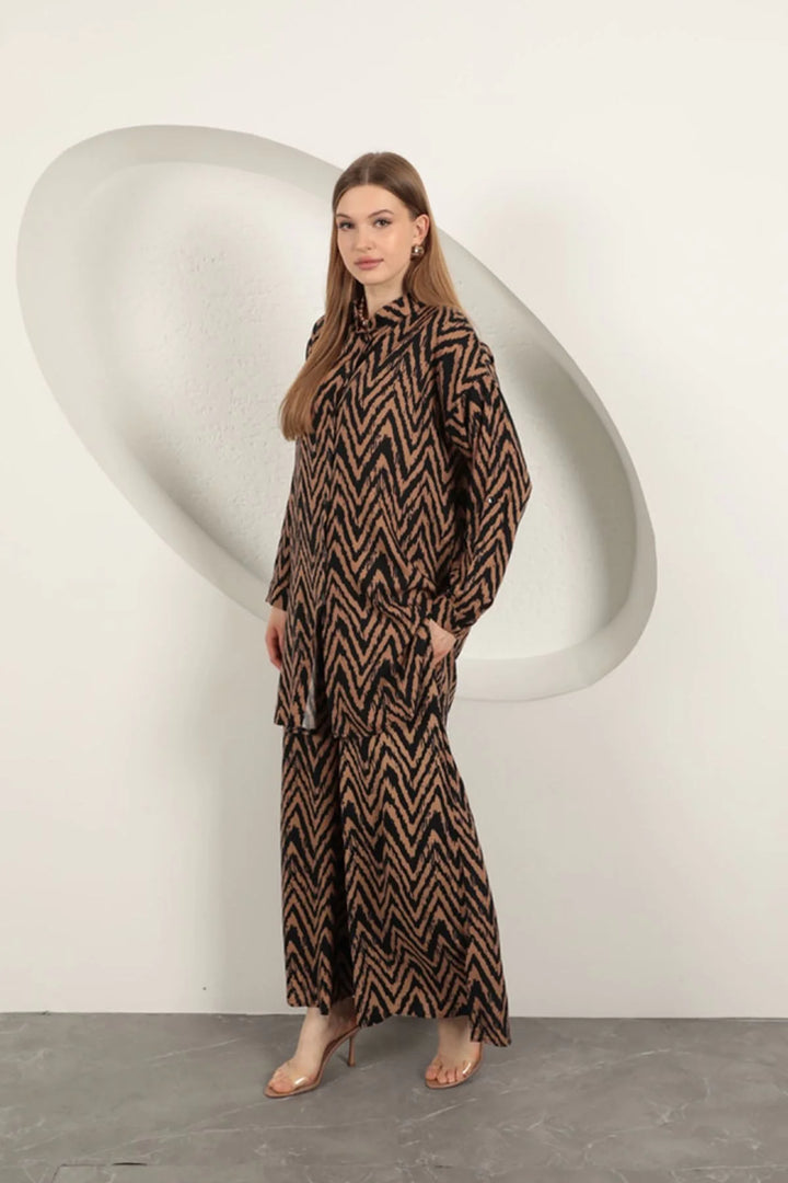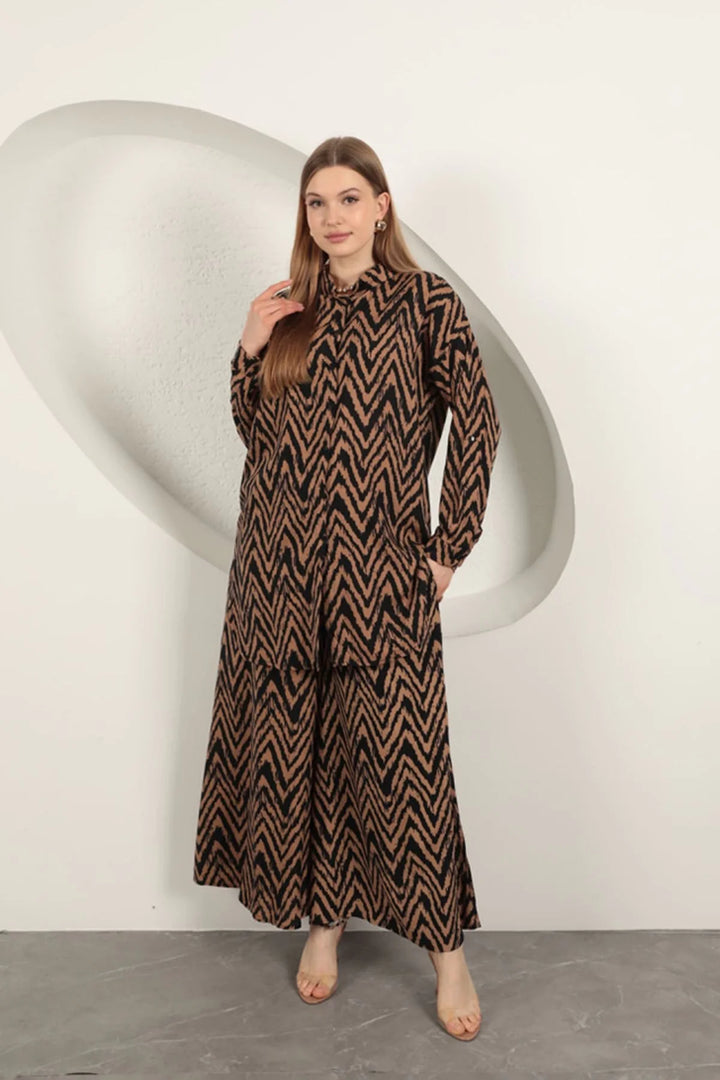 Viskon Kumaş Çizgili Kadın Takım-Camel