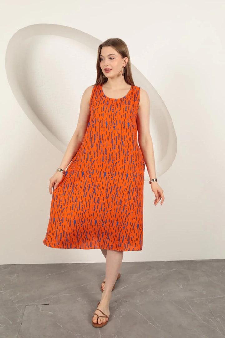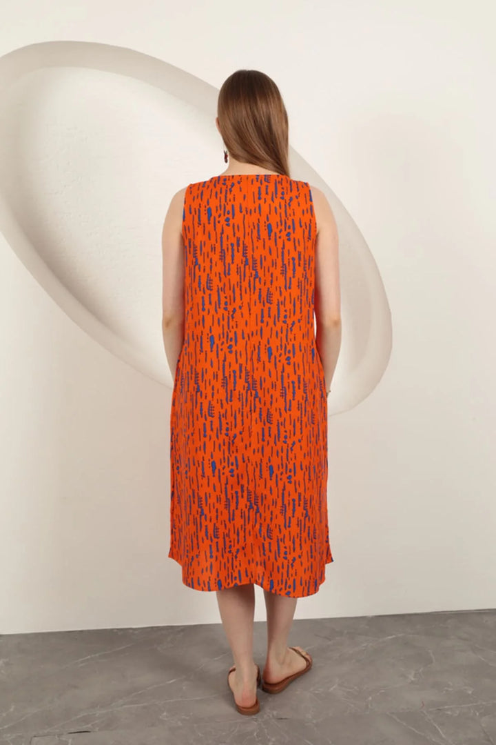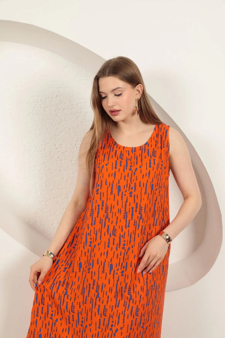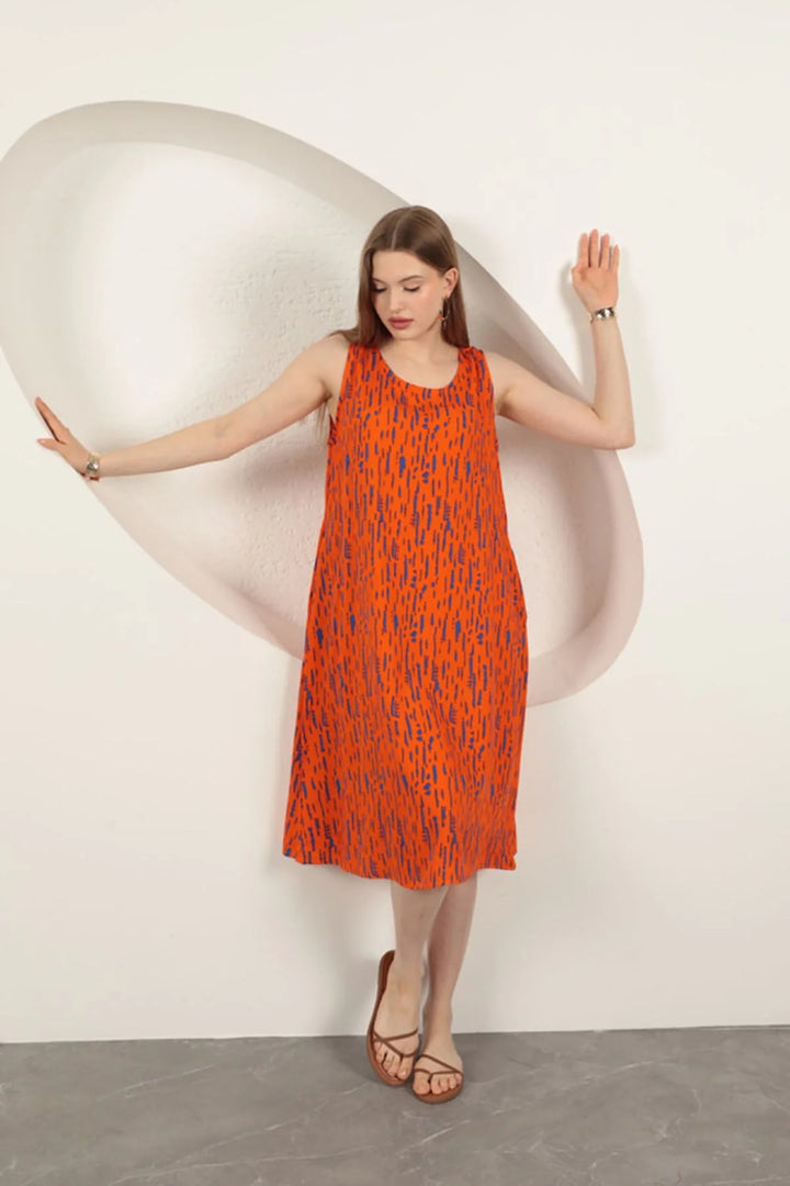 Viskon Kumaş Desenli Elbise-Oranj