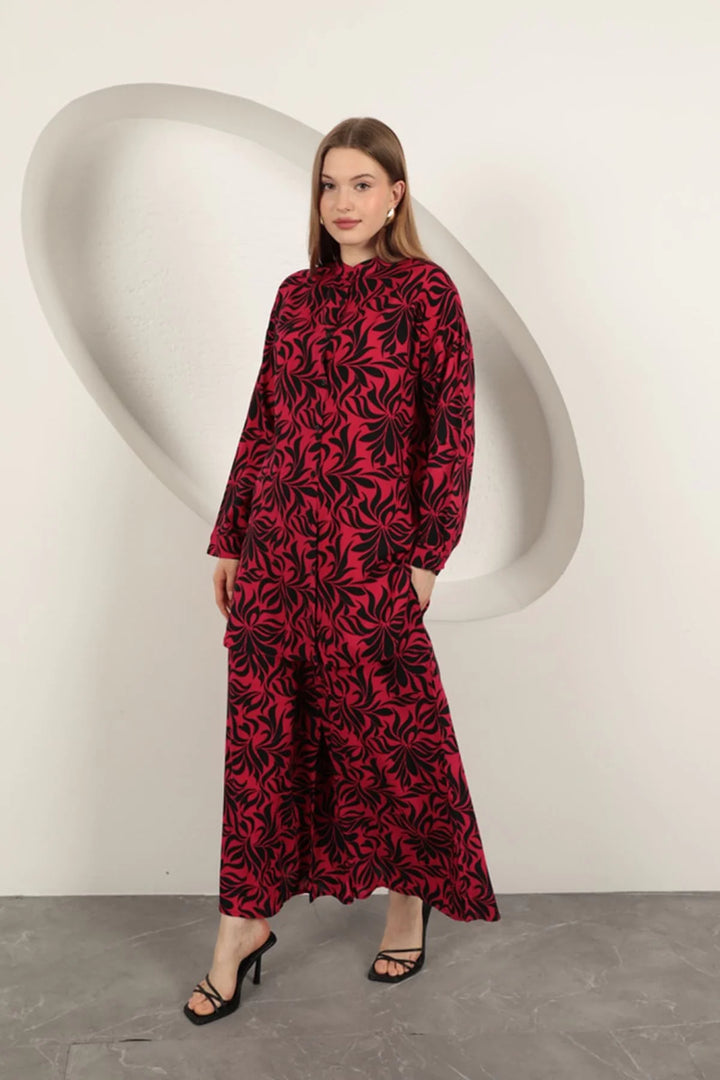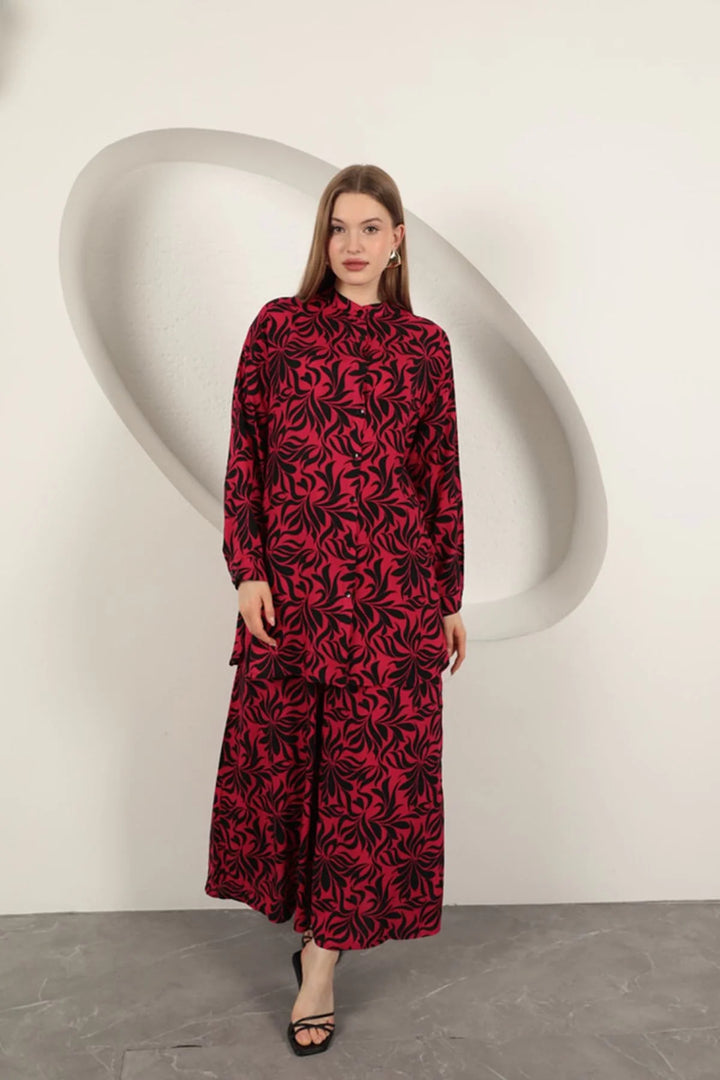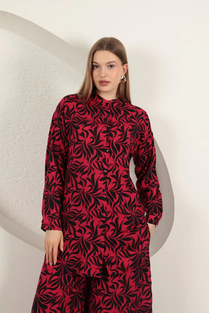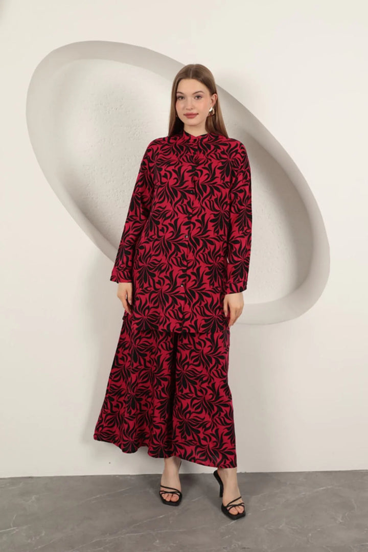 Viskon Kumaş Desenli Kadın Takım-Fuşya