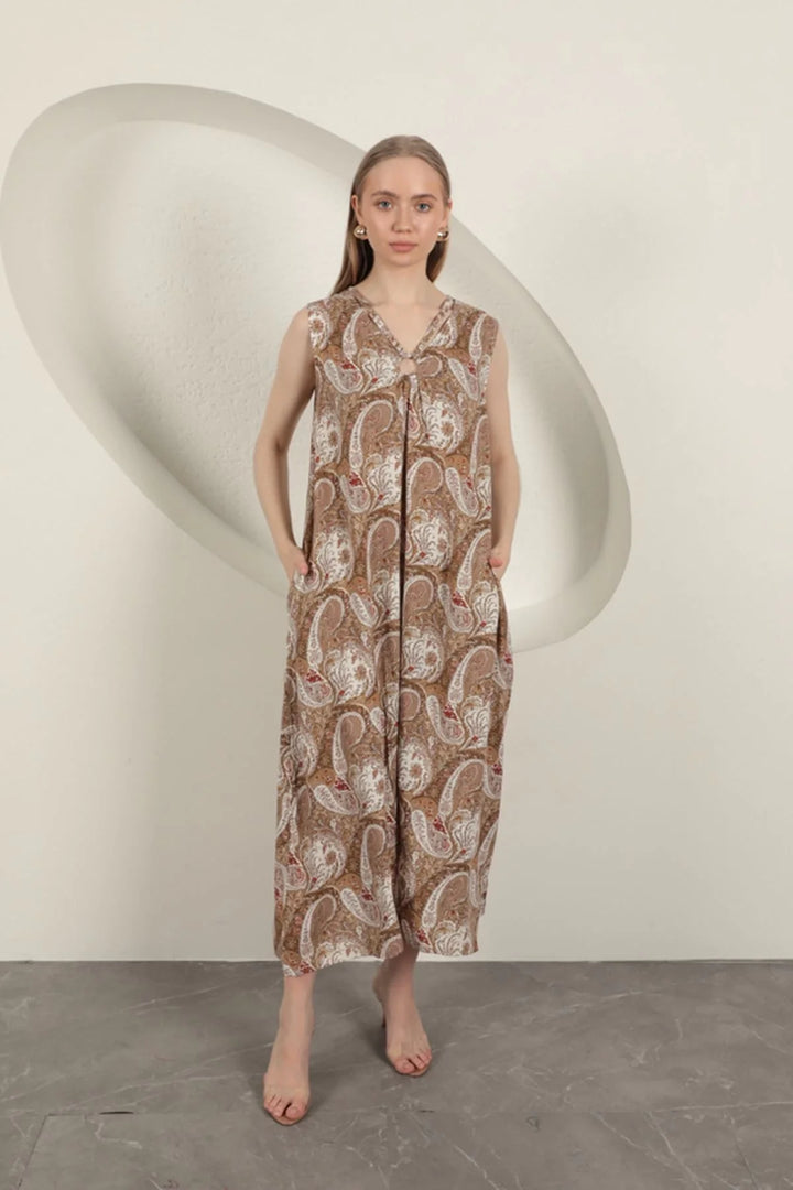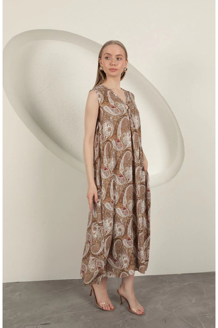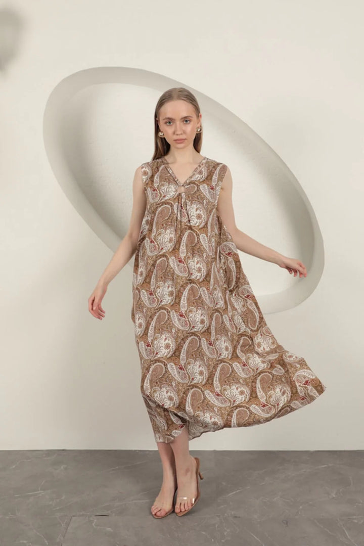 Viskon Kumaş Etnik Desenli Elbise-Bej
