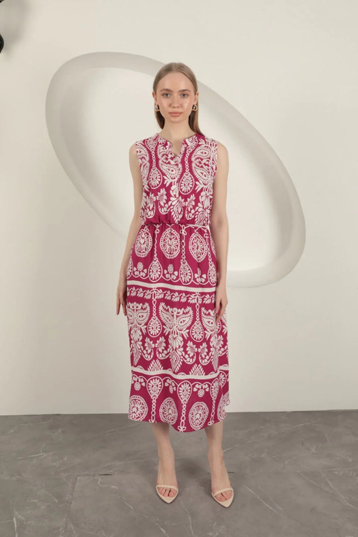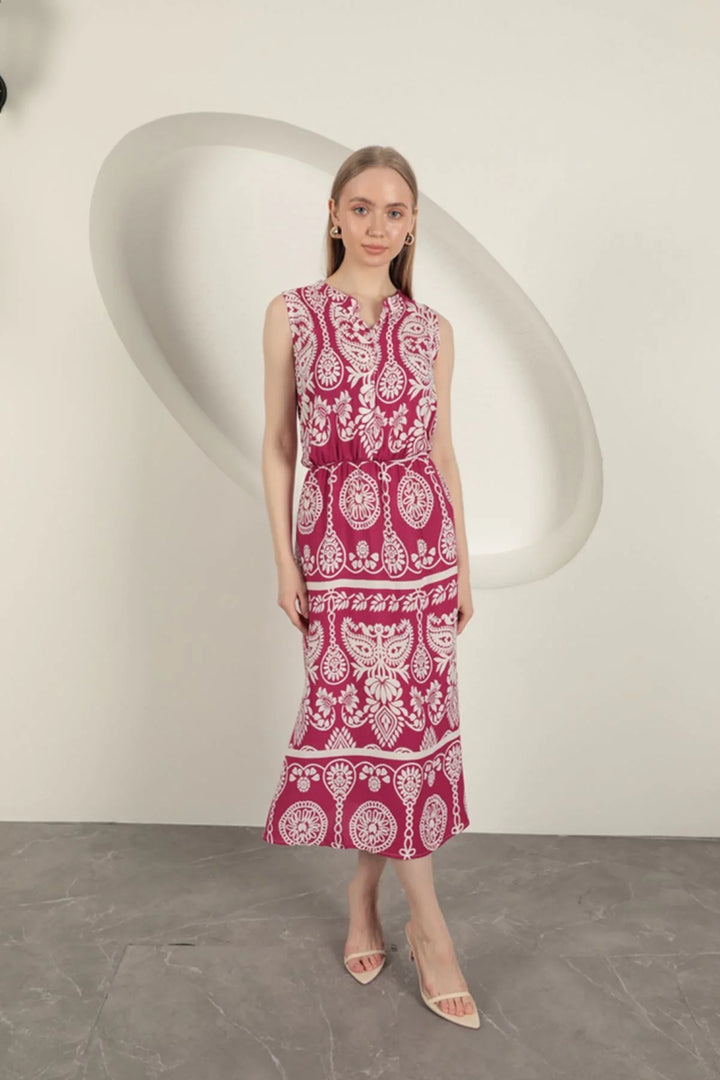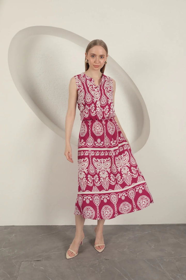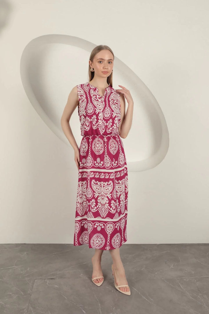 Viskon Kumaş Etnik Desenli Elbise-Fuşya