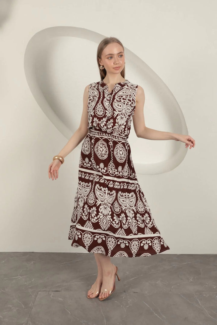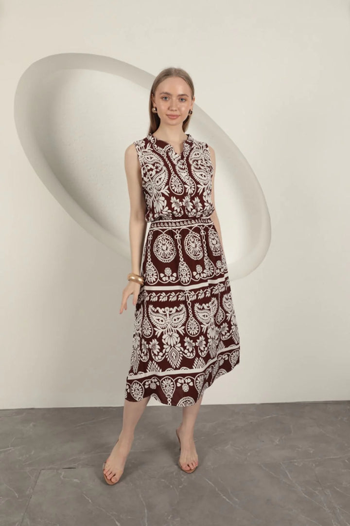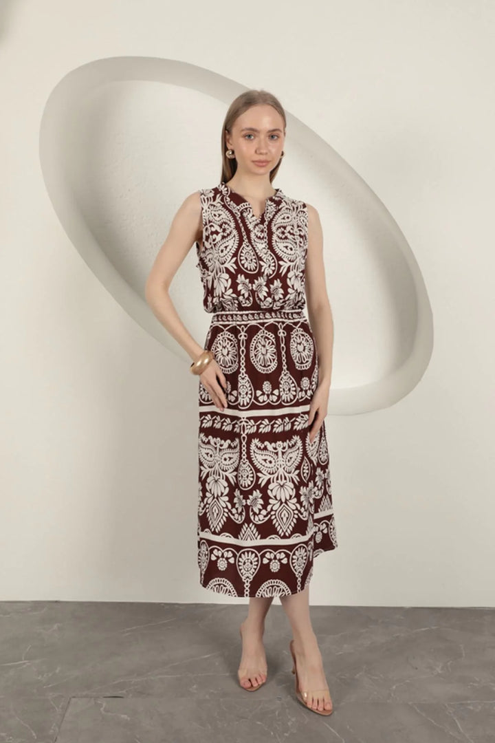 Viskon Kumaş Etnik Desenli Elbise-Kahve