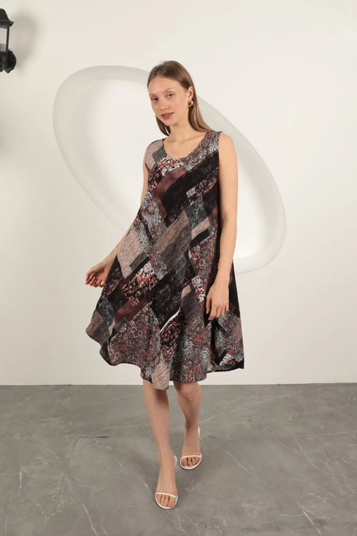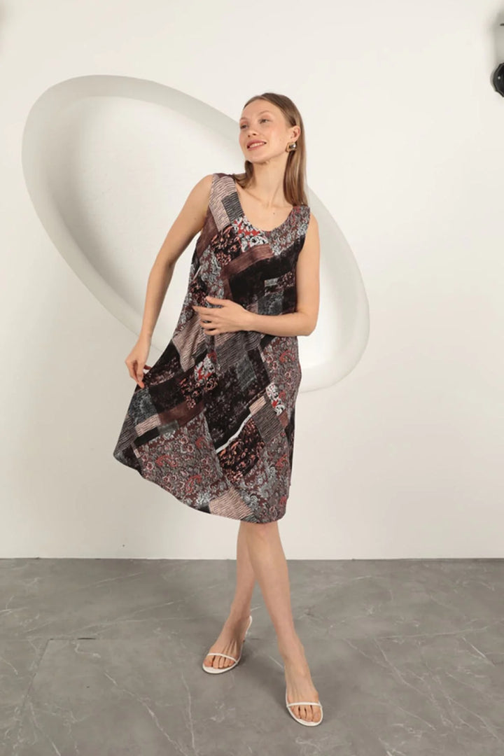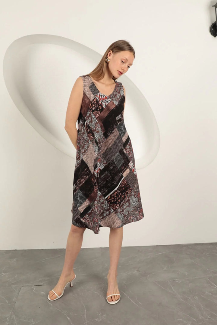 Viskon Kumaş Etnik Desenli Elbise-Kahve