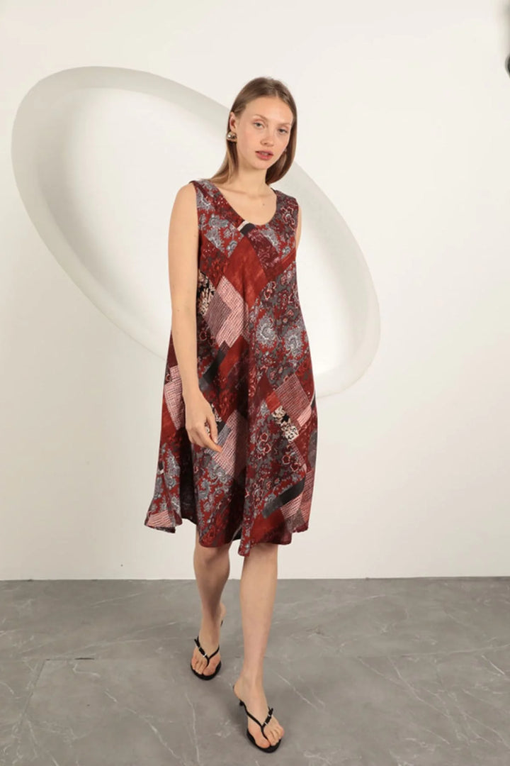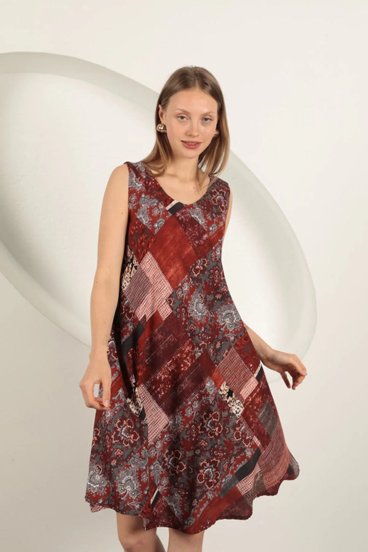 Viskon Kumaş Etnik Desenli Elbise-Kiremit