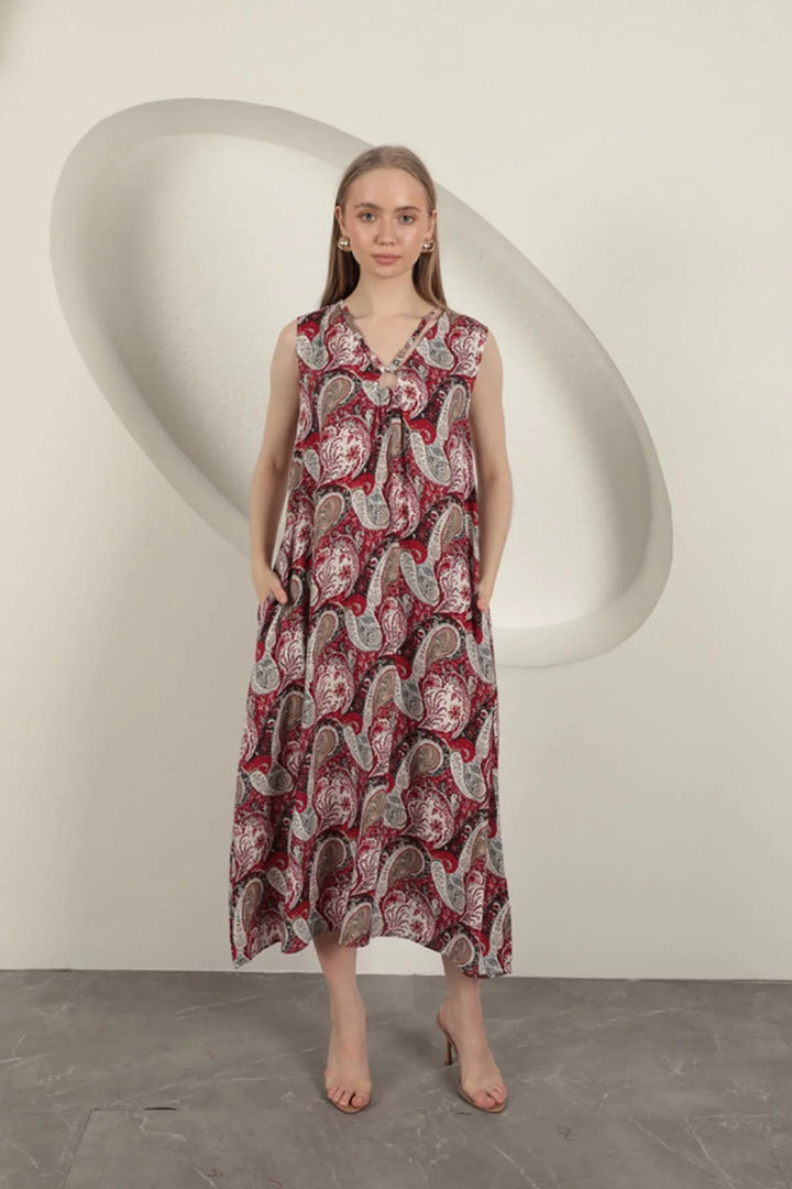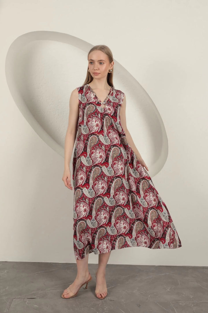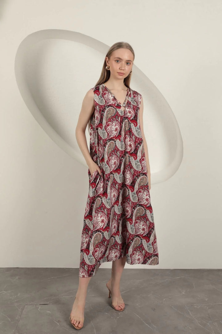 Viskon Kumaş Etnik Desenli Elbise-Kırmızı