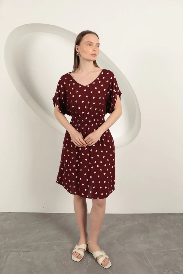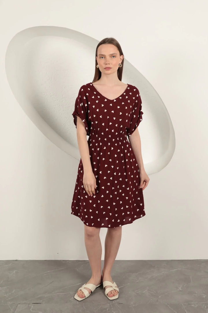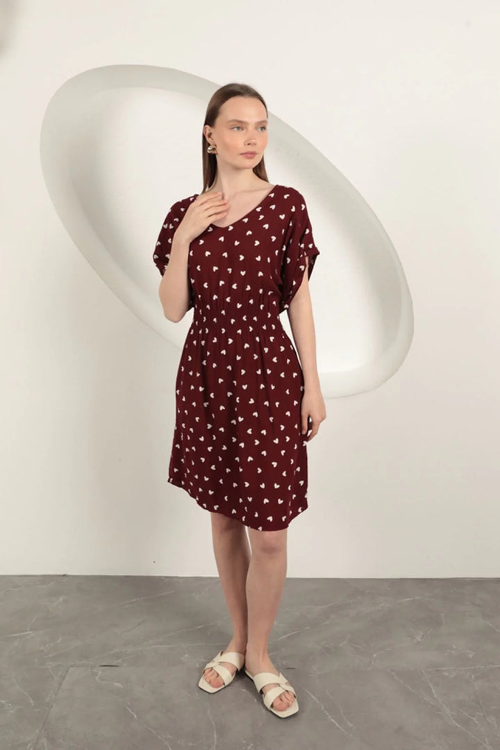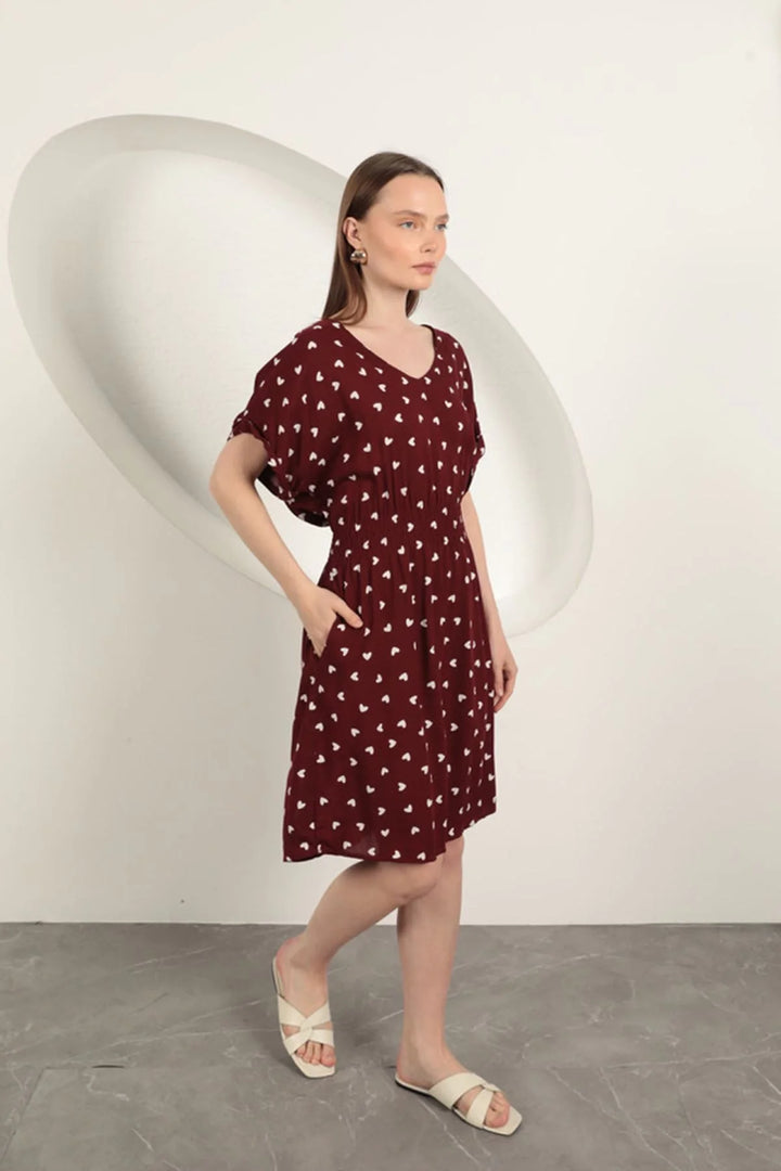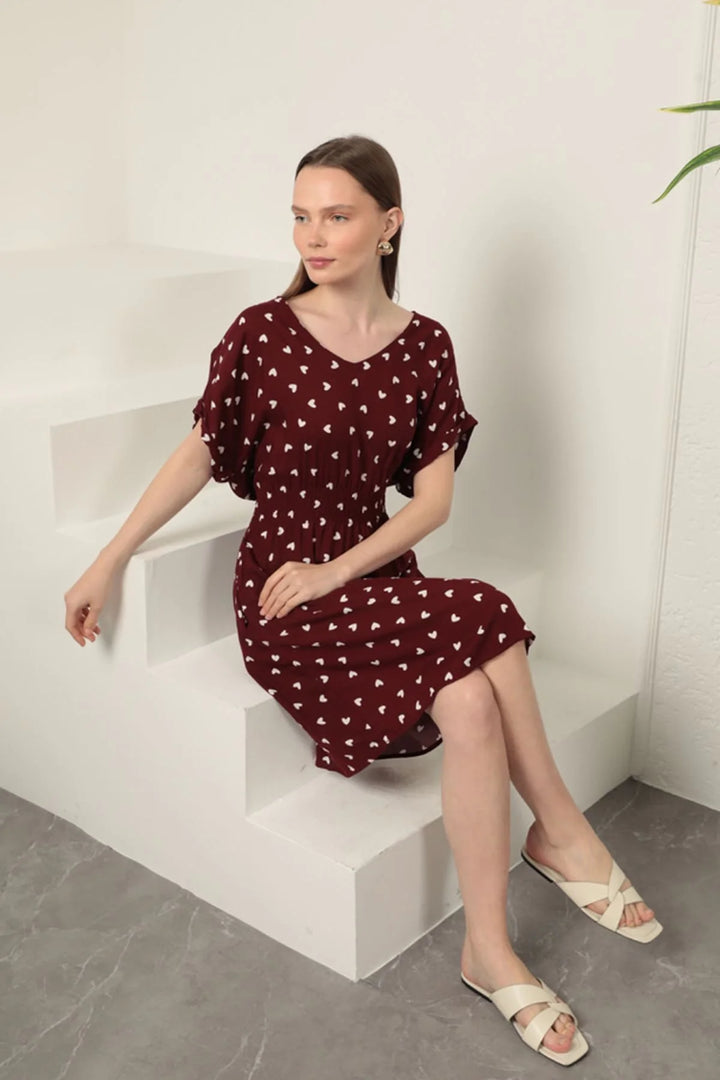 Viskon Kumaş Kalp Desenli Elbise-Bordo