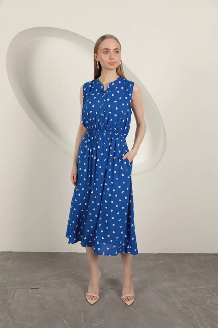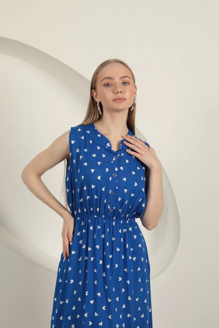 Viskon Kumaş Kalp Desenli Elbise-Saks