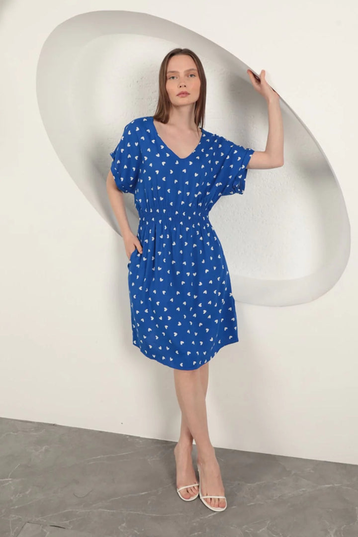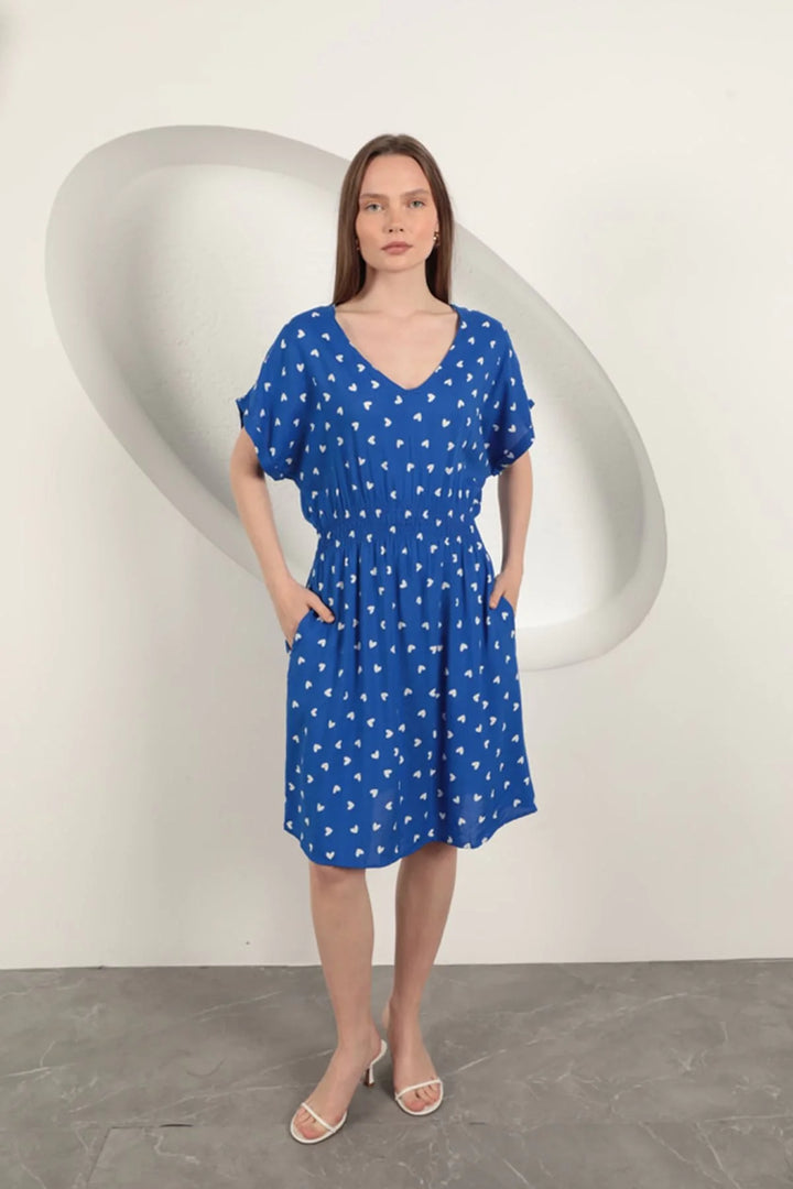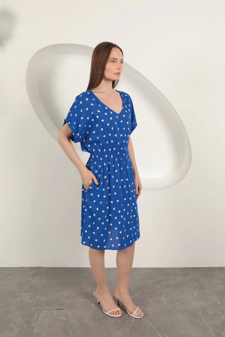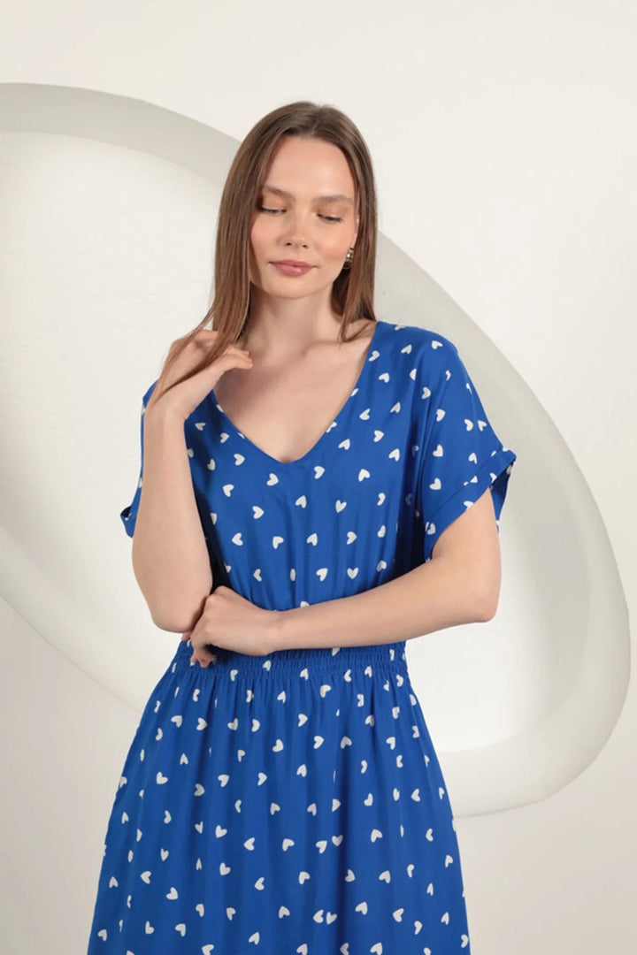 Viskon Kumaş Kalp Desenli Elbise-Saks