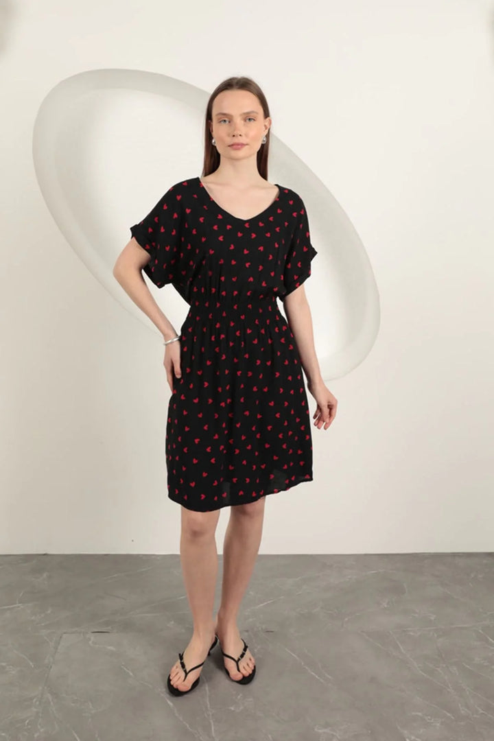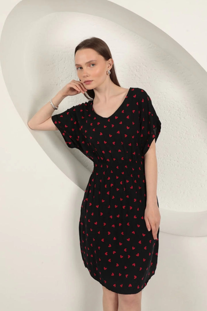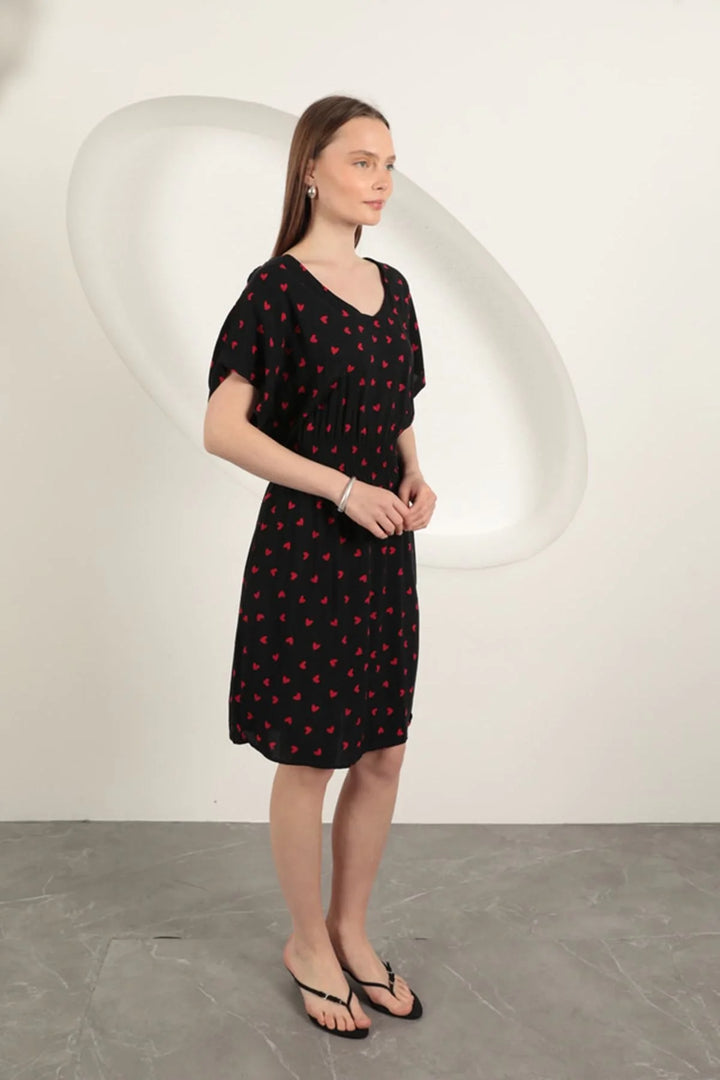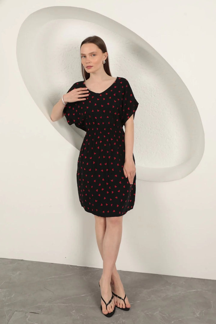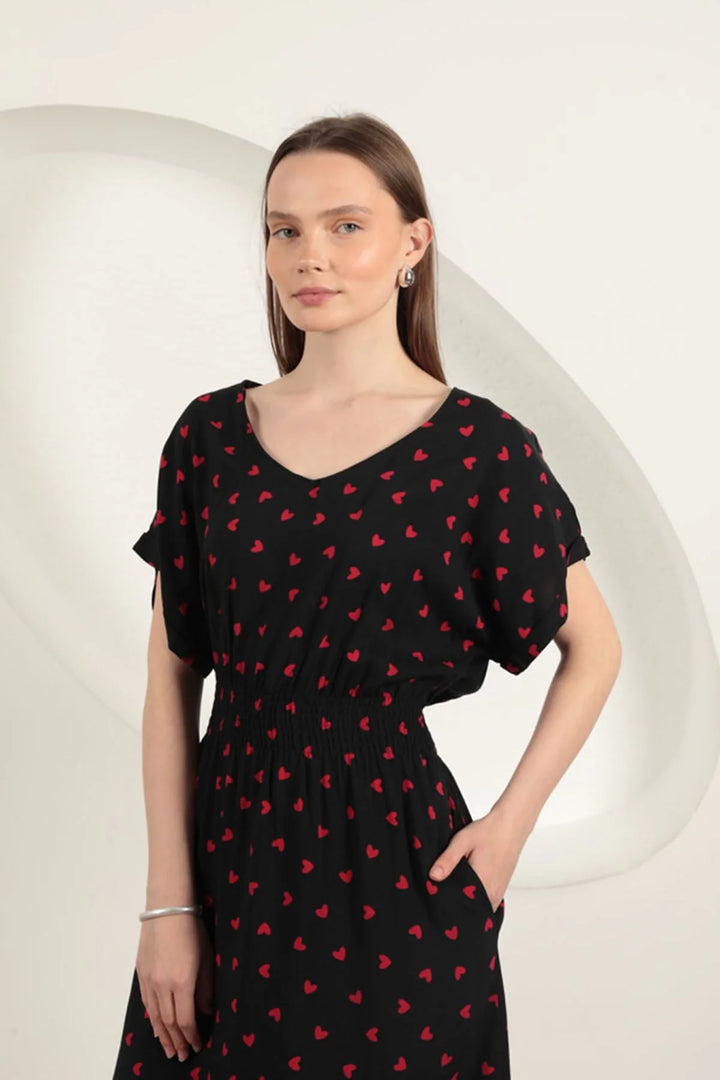 Viskon Kumaş Kalp Desenli Elbise-Siyah
