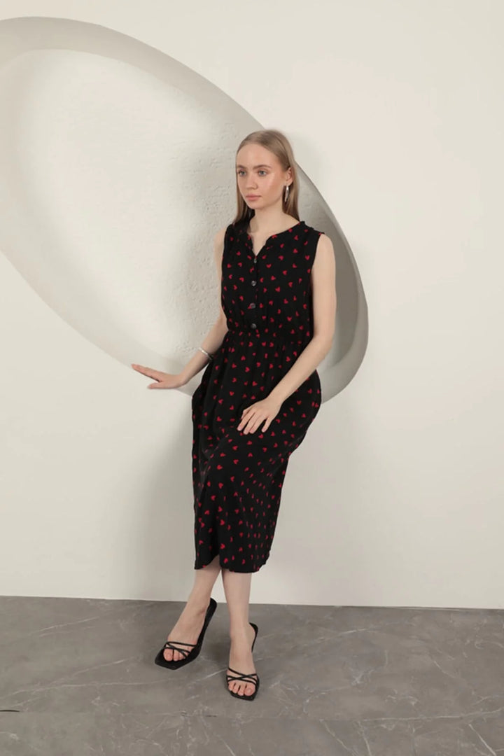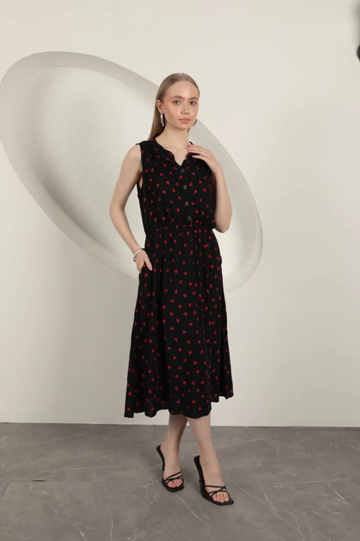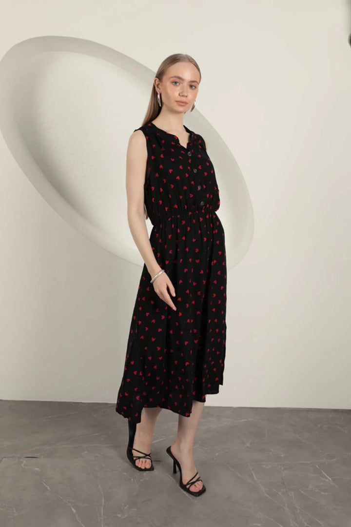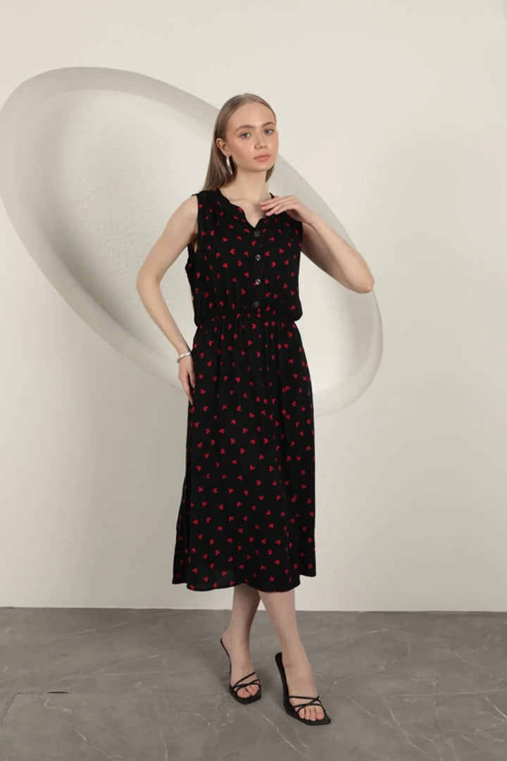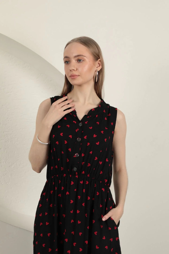 Viskon Kumaş Kalp Desenli Elbise-Siyah/Kırmızı