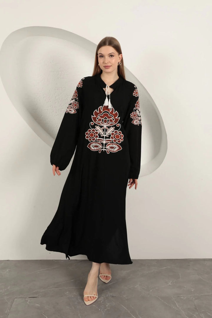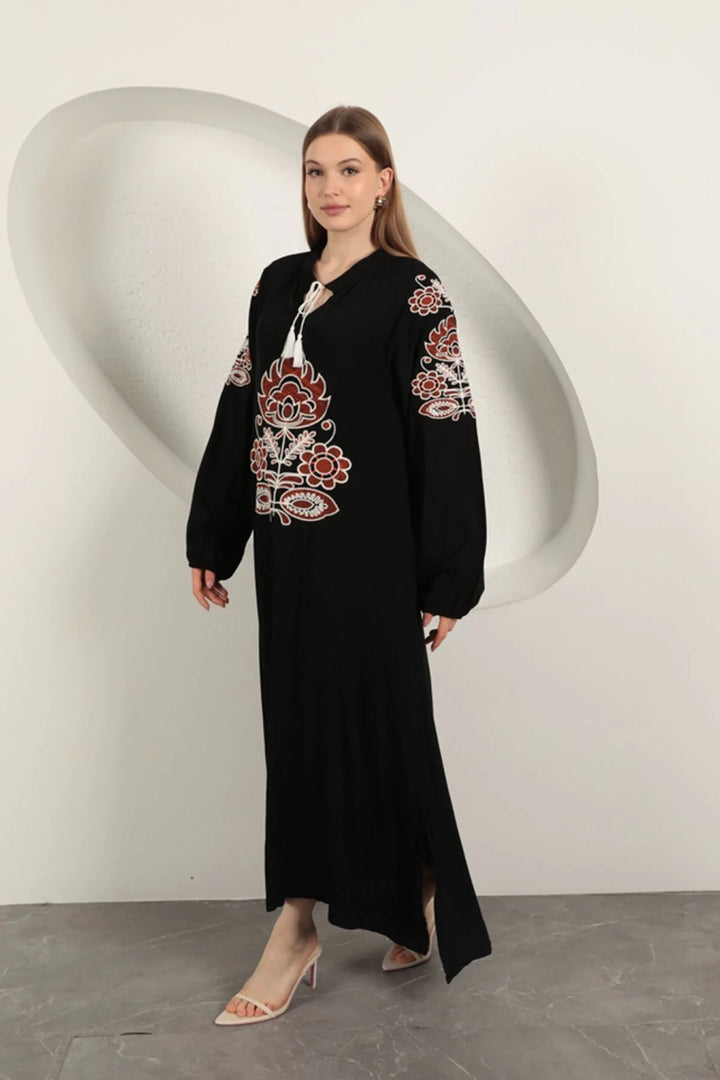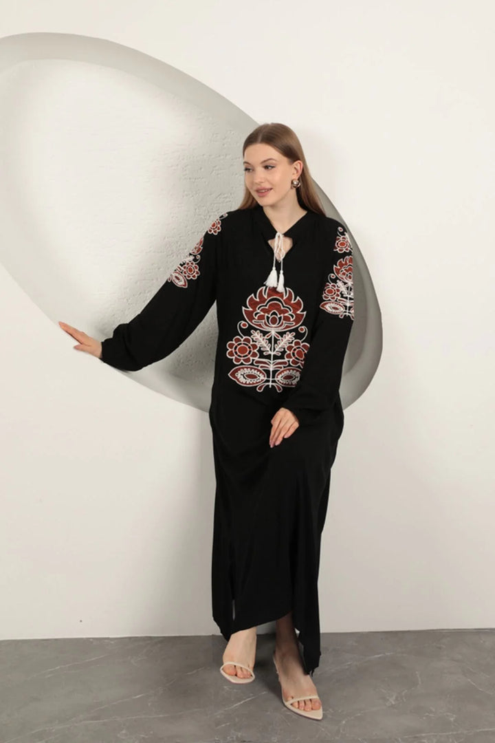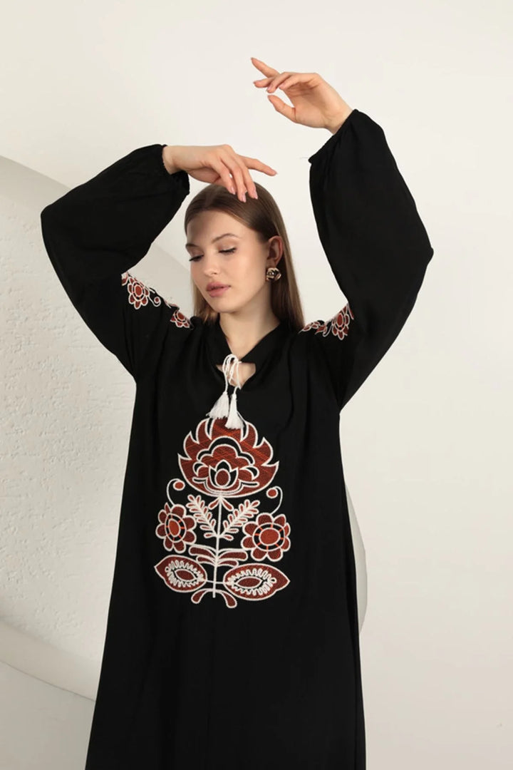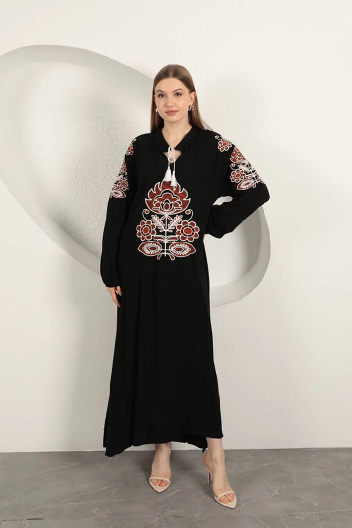 Viskon Kumaş Nakışlı Elbise-Siyah