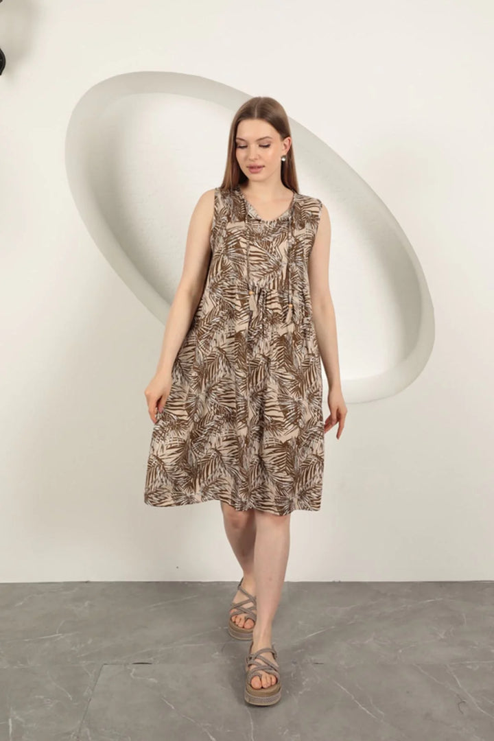 Viskon Kumaş Palmiye Desen Elbise-Kahve