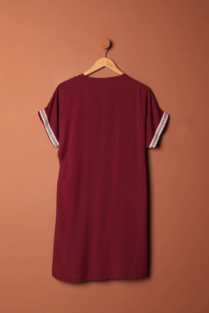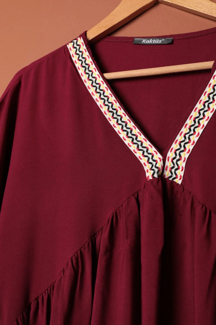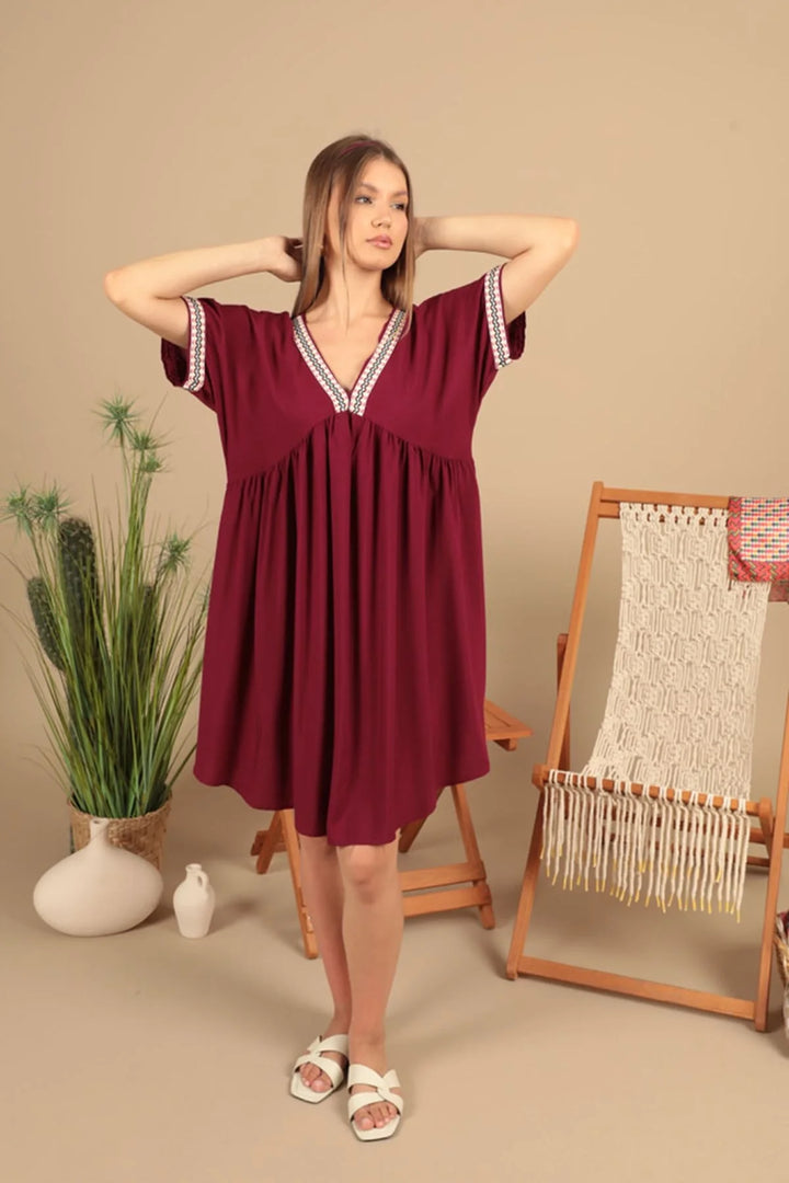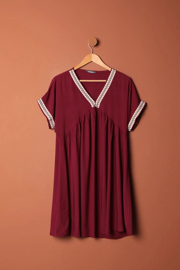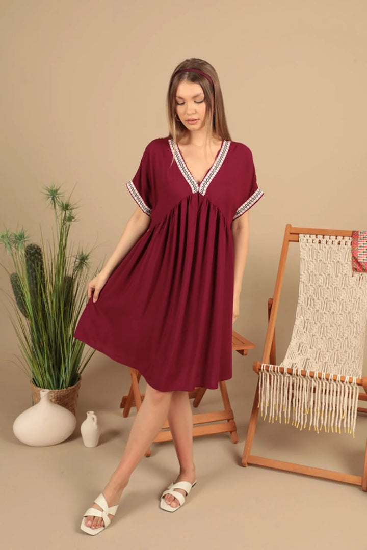 Viskon Kumaş Yakası Kolu Şerit Detaylı Elbise-Bordo