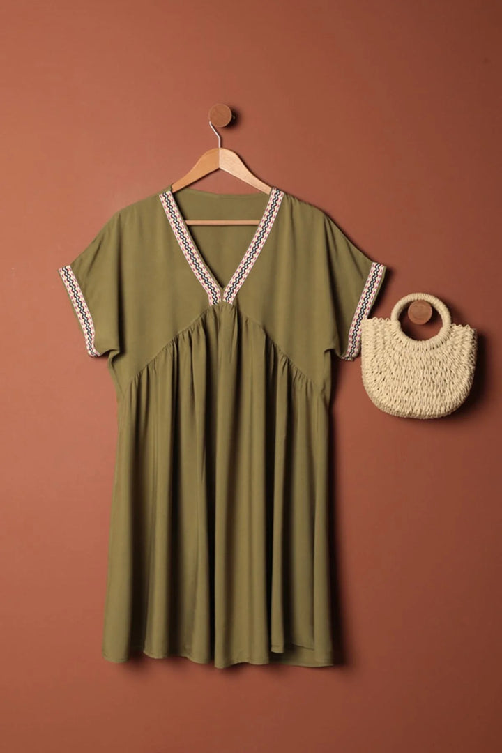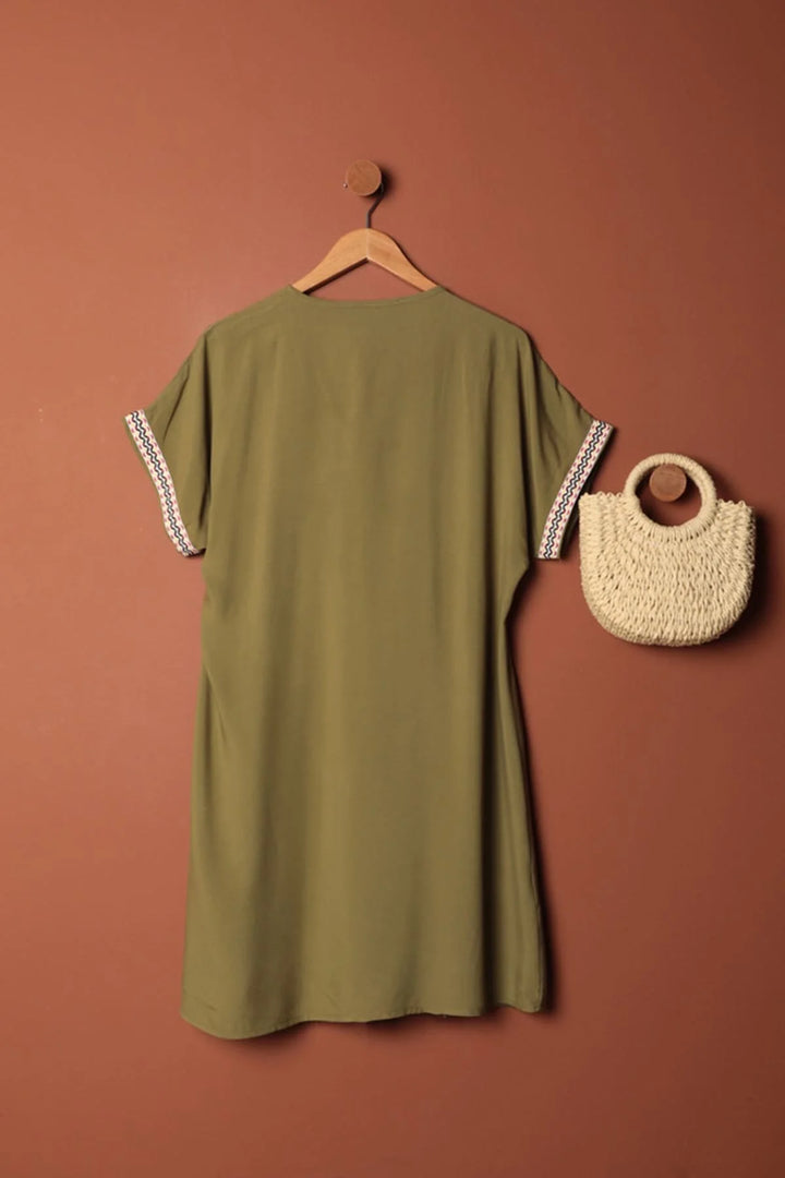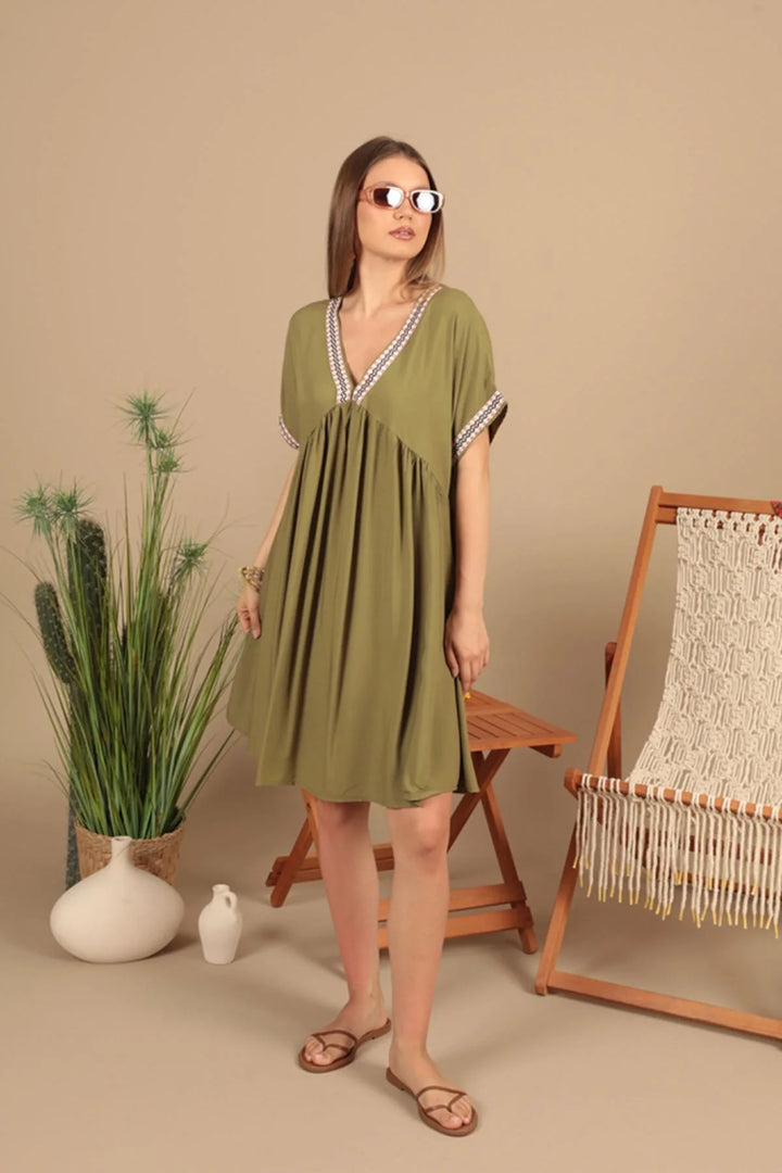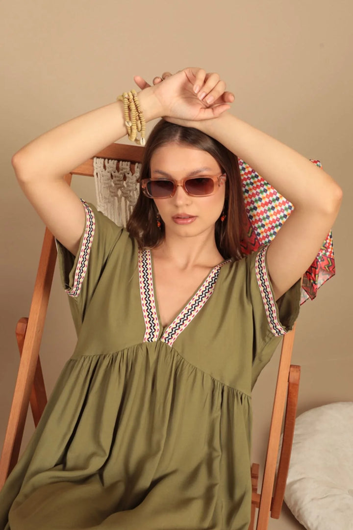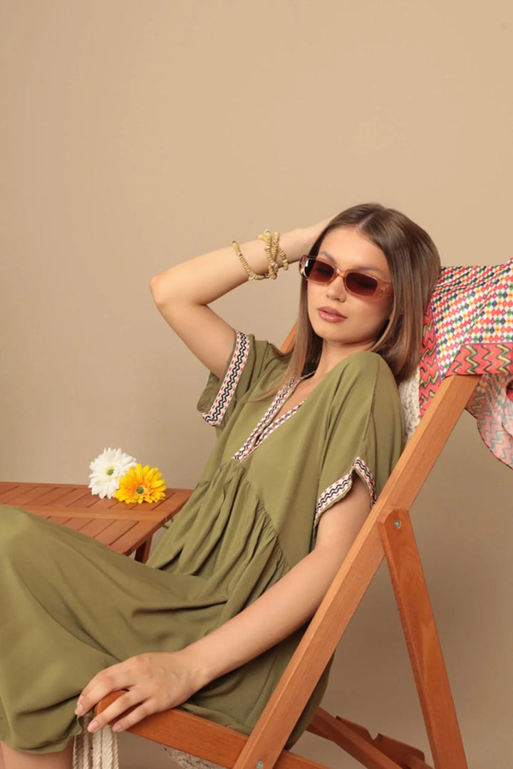 Viskon Kumaş Yakası Kolu Şerit Detaylı Elbise-Haki
