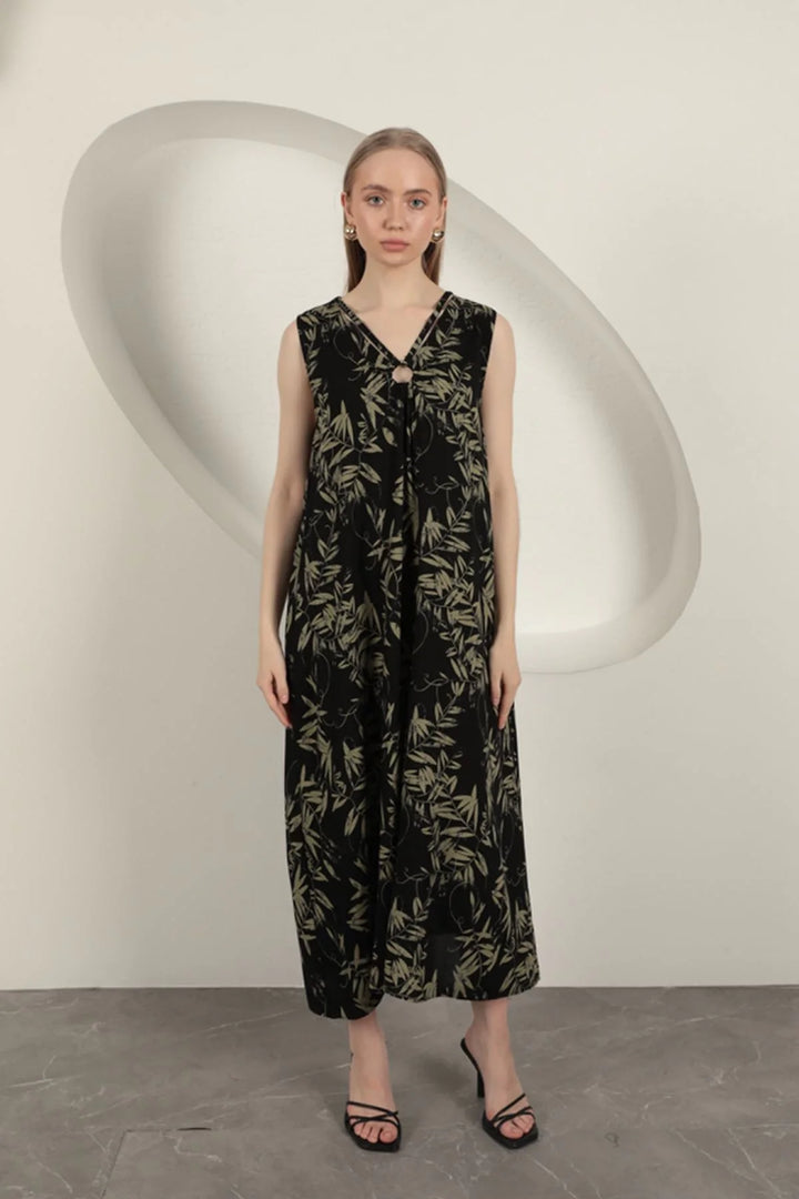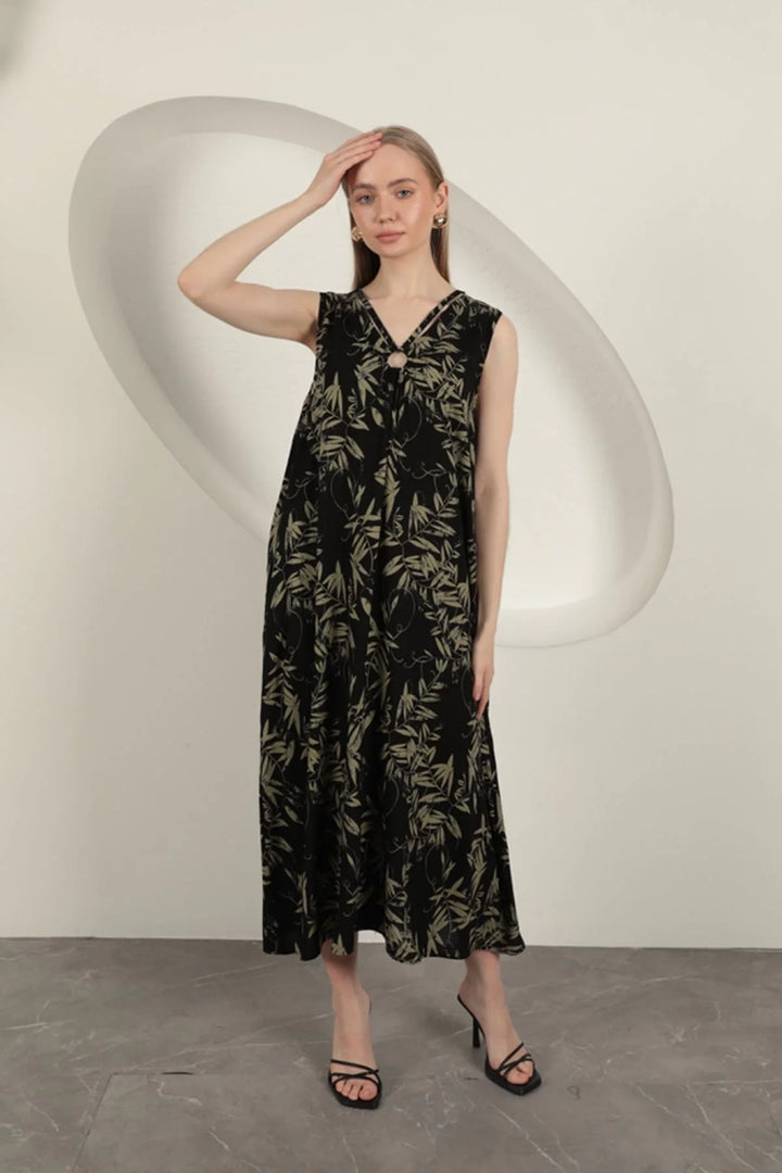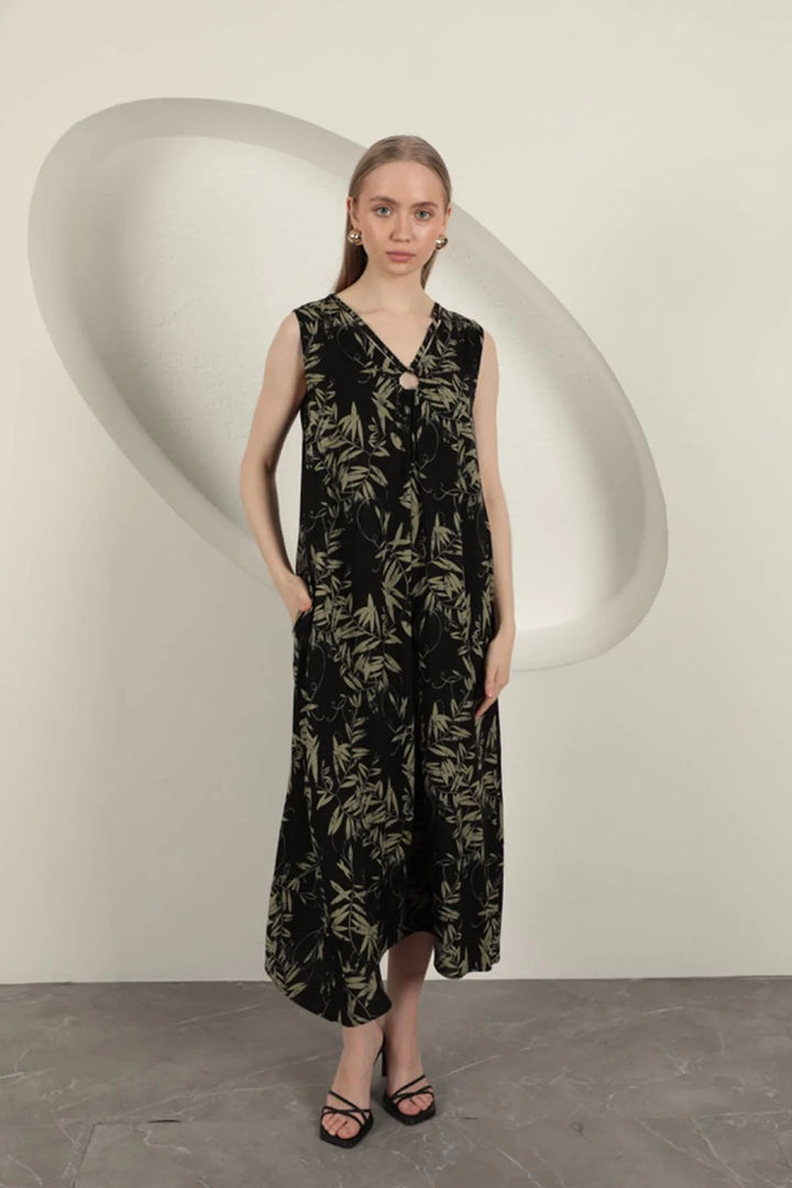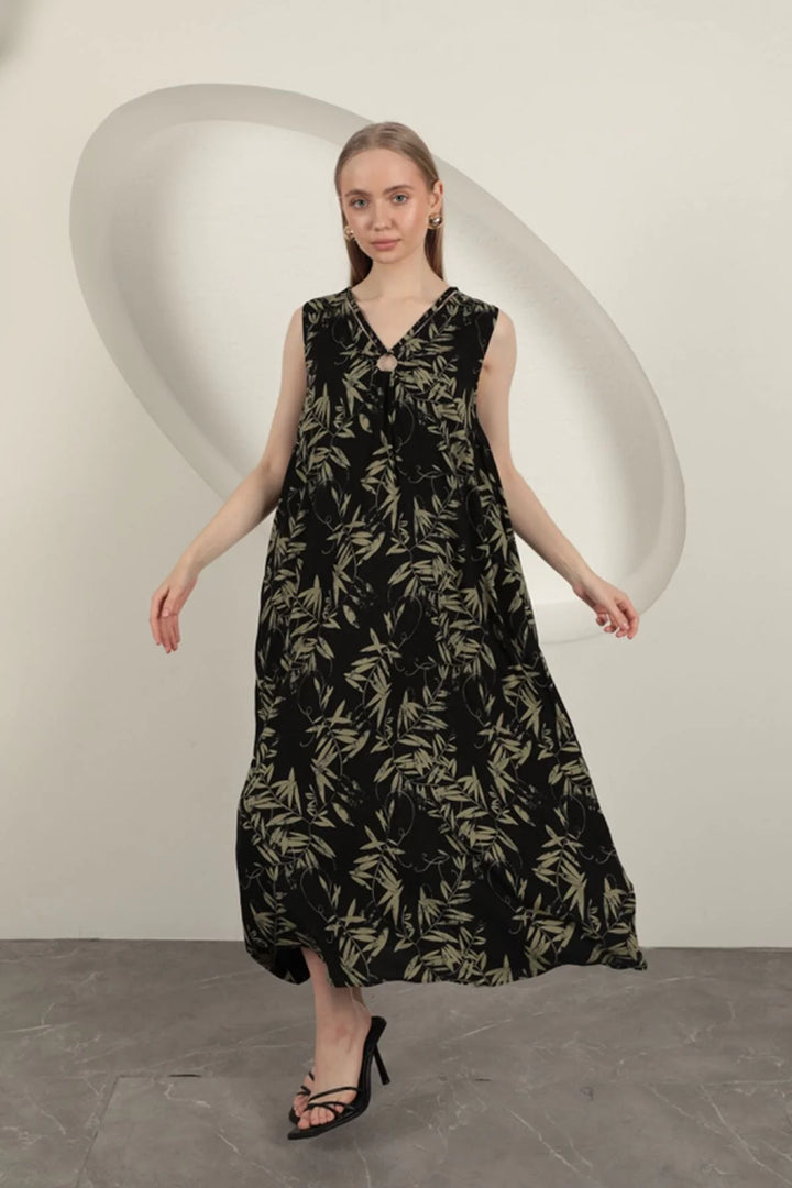 Viskon Kumaş Yaprak Desenli Elbise-Haki