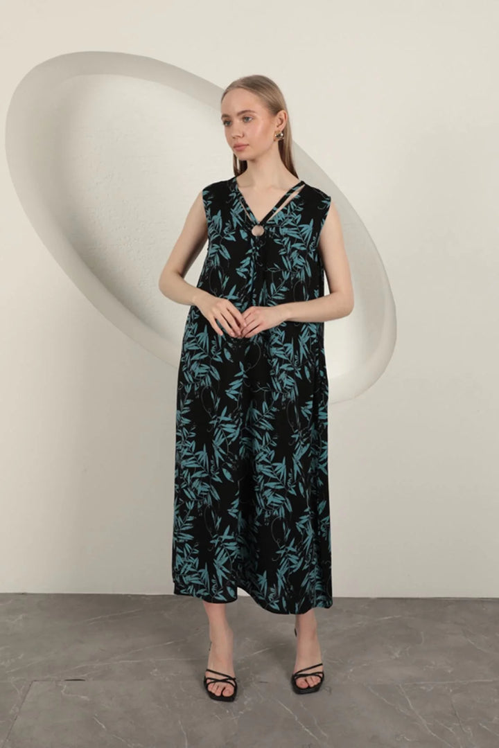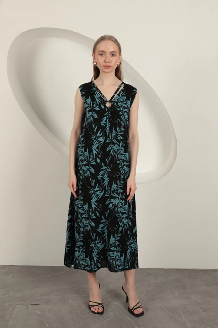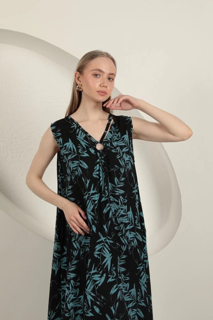 Viskon Kumaş Yaprak Desenli Elbise-Mavi