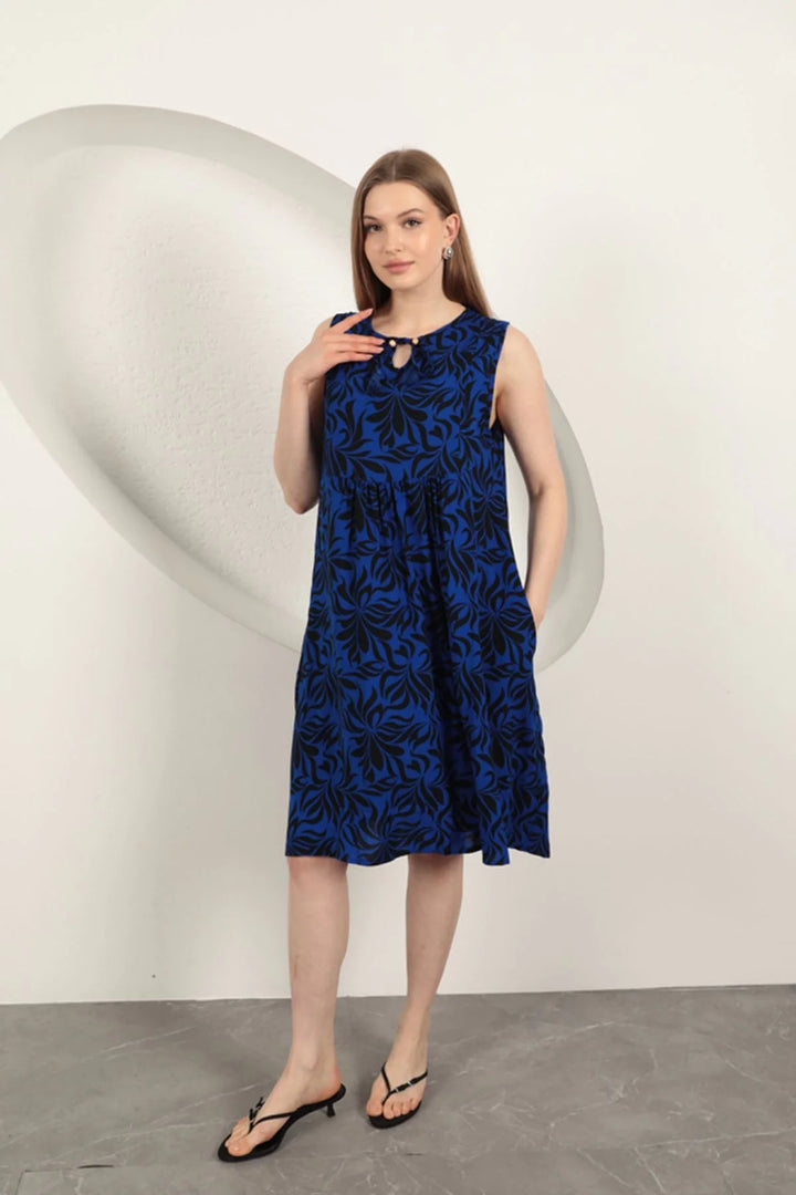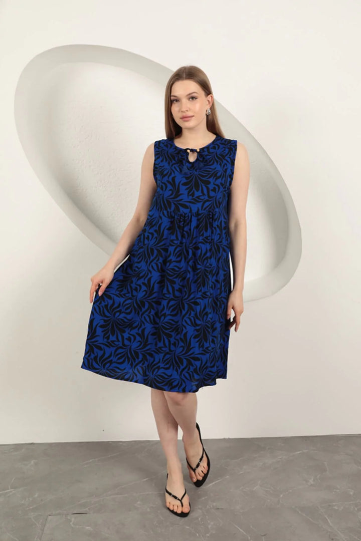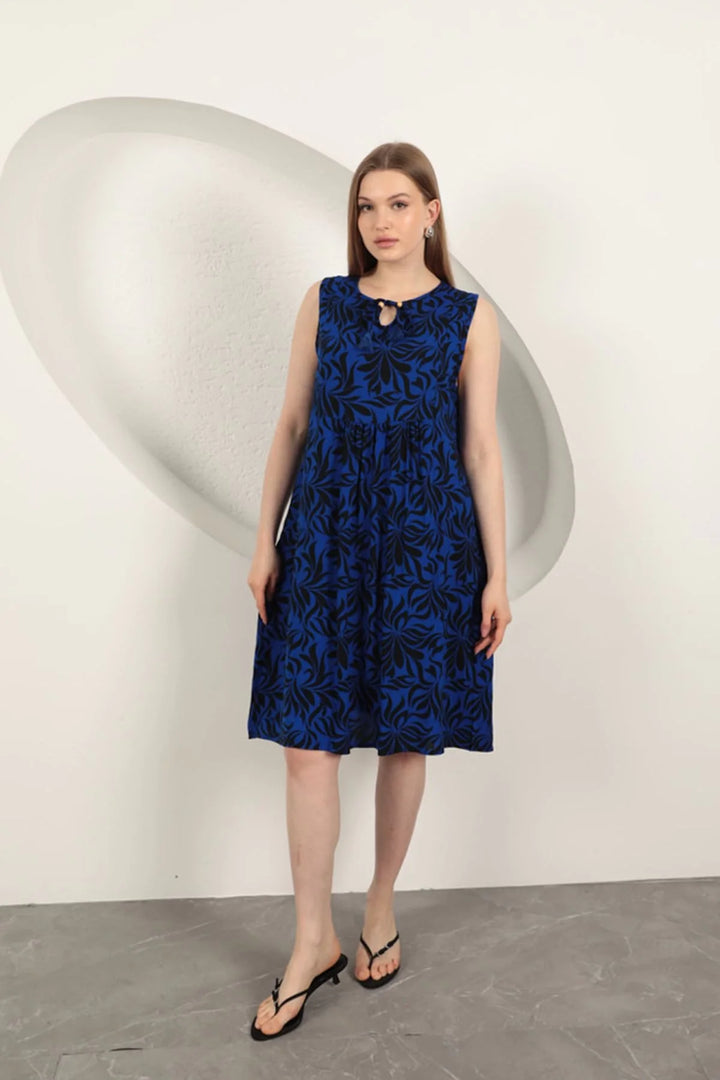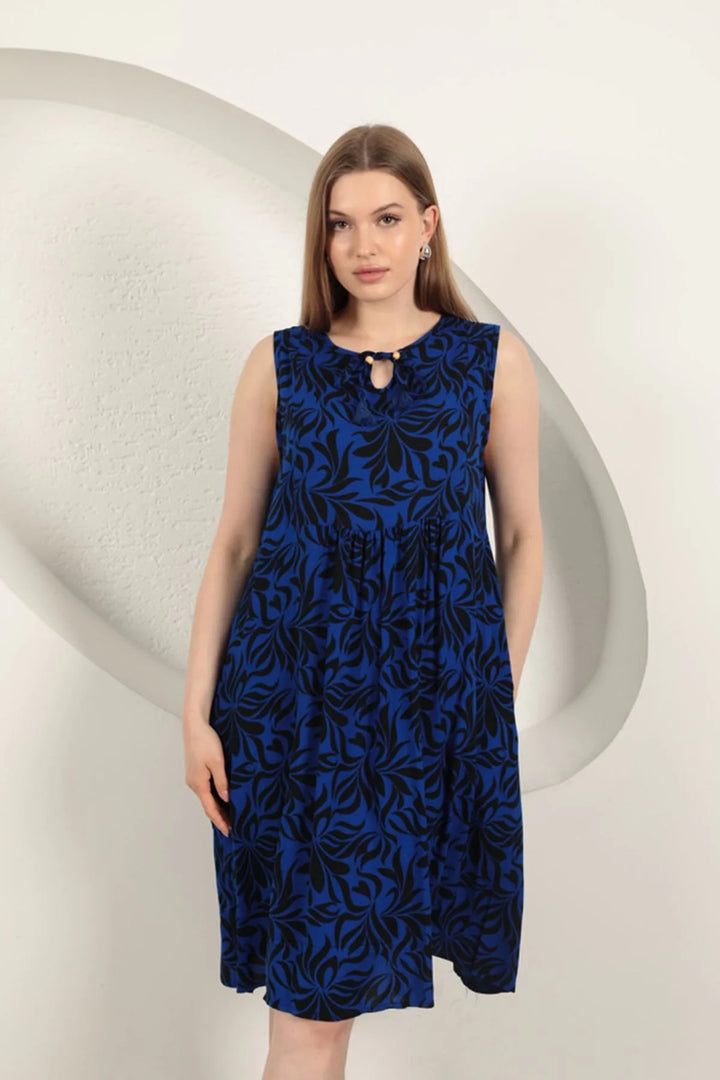 Viskon Kumaş Yaprak Desenli Elbise-Saks