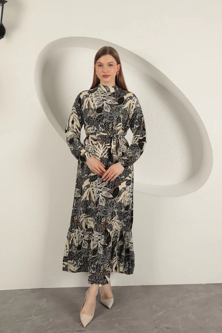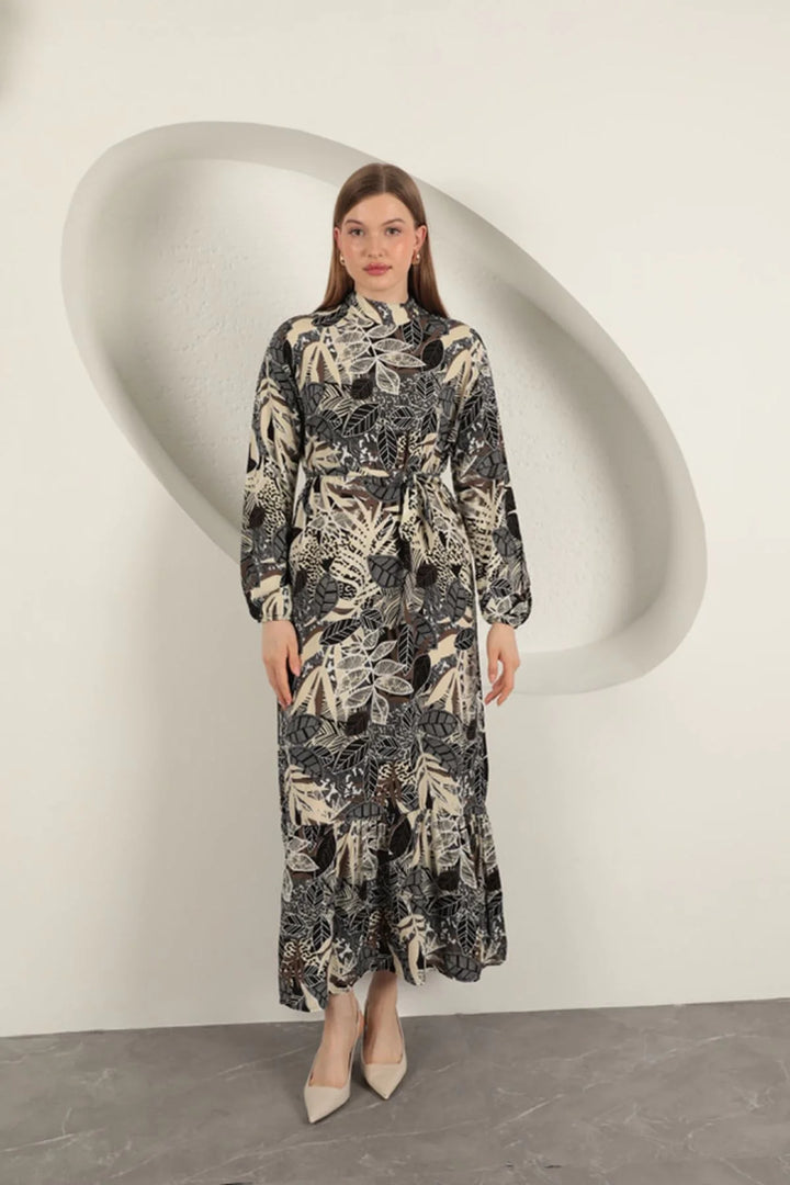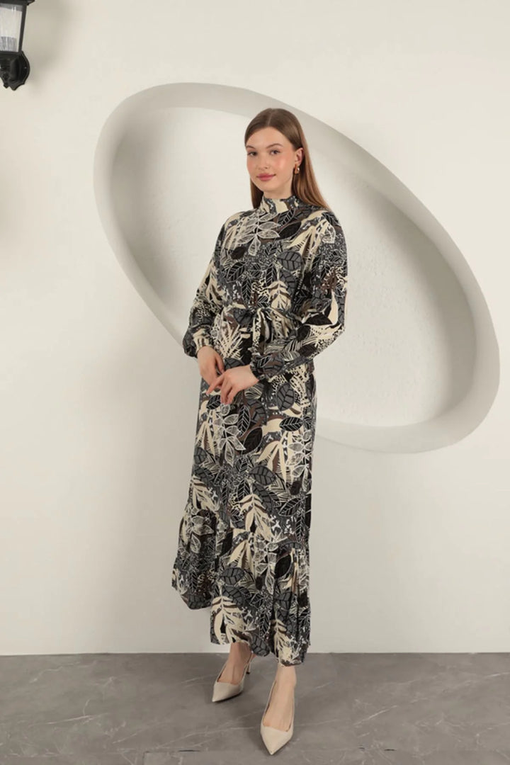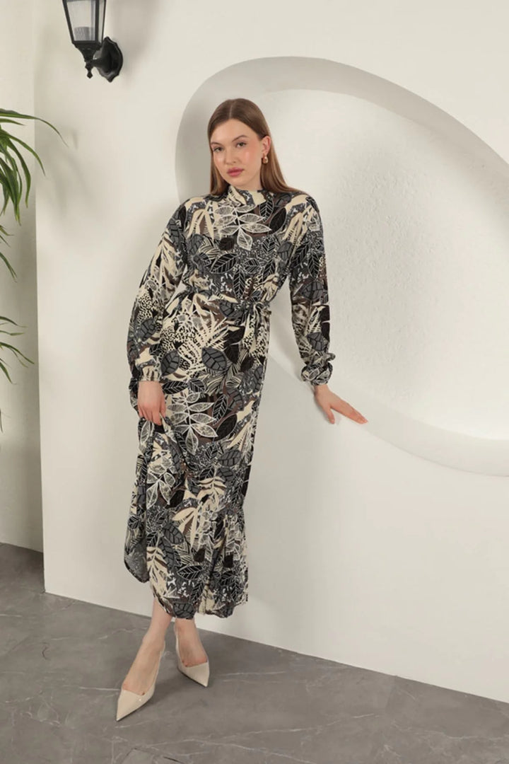 Viskon Kumaş Yaprak Desenli Elbise-Siyah
