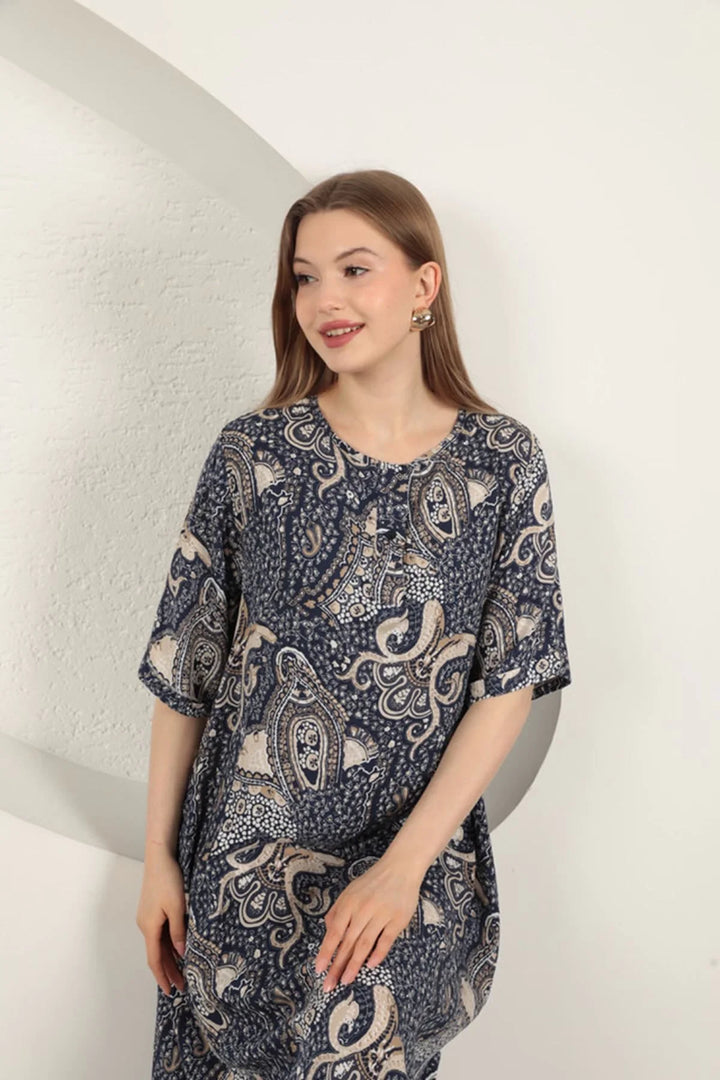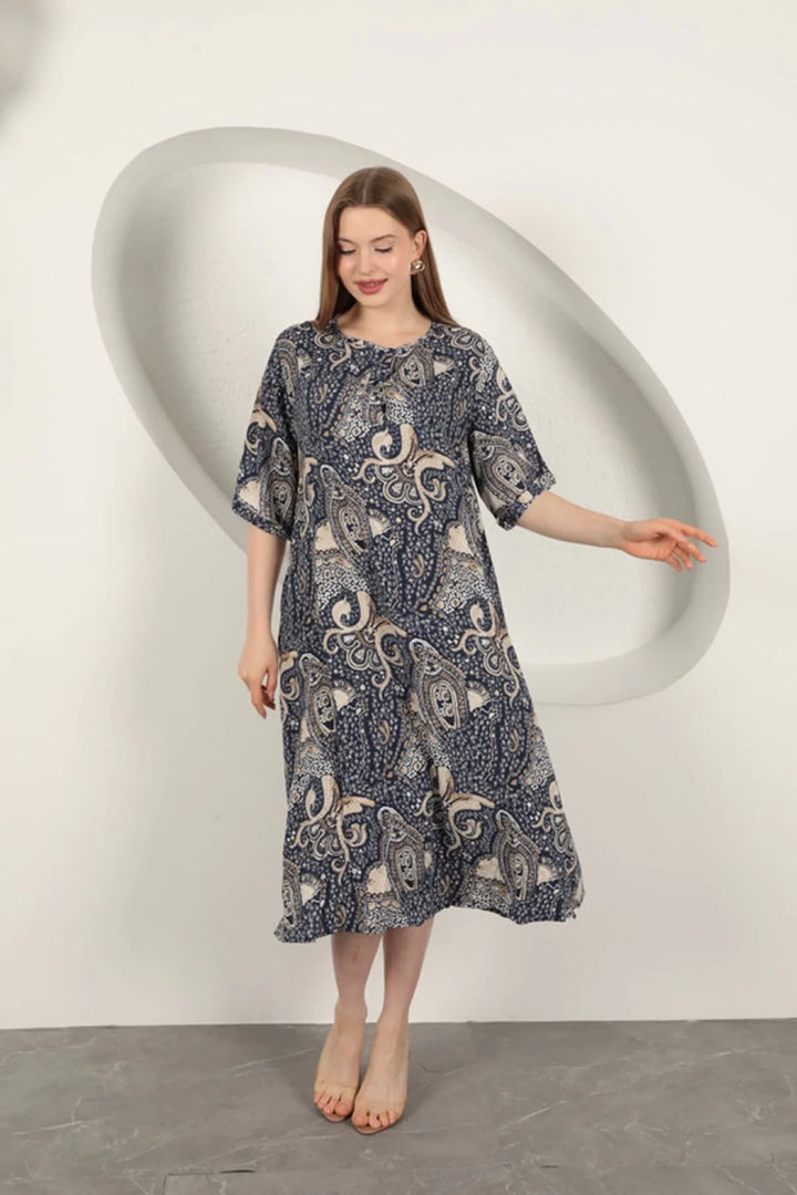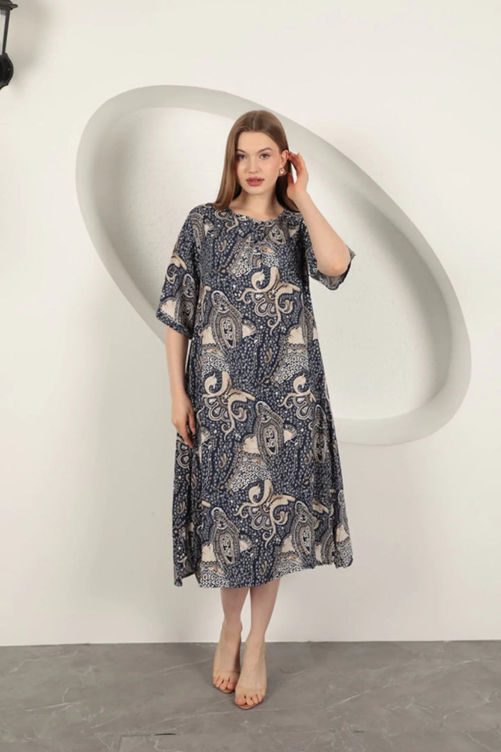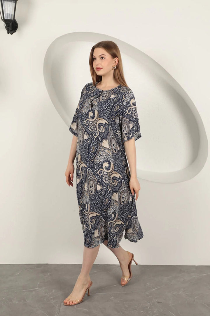 Viskon Şal Desenli Elbise-Lacivert