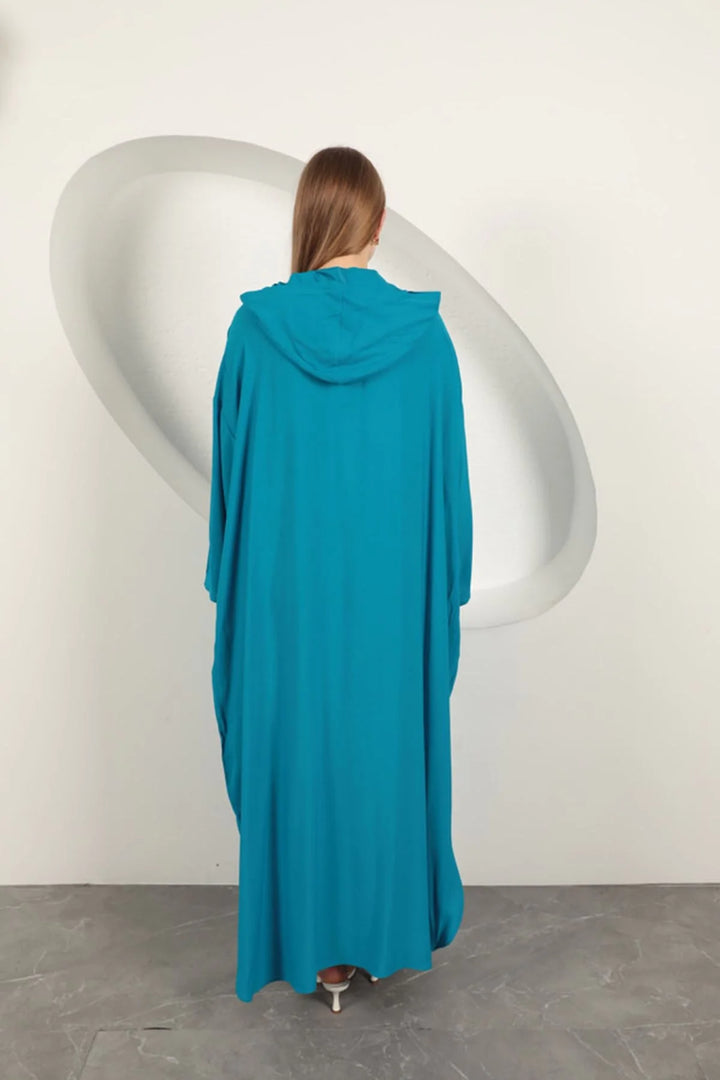 Viskon Yaprak Nakışlı Elbise-Mavi