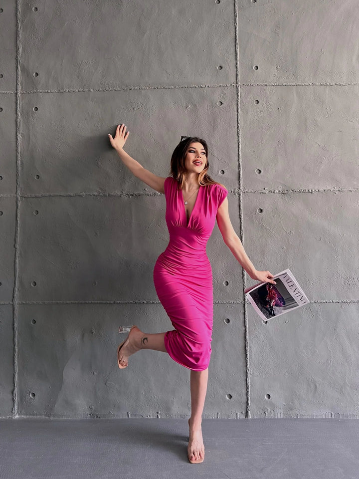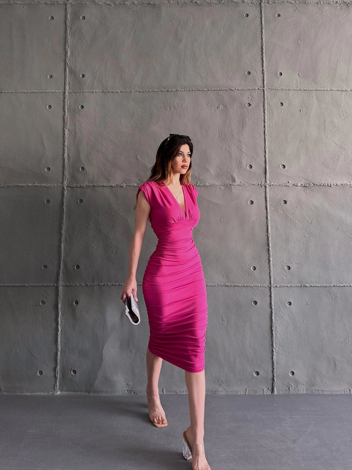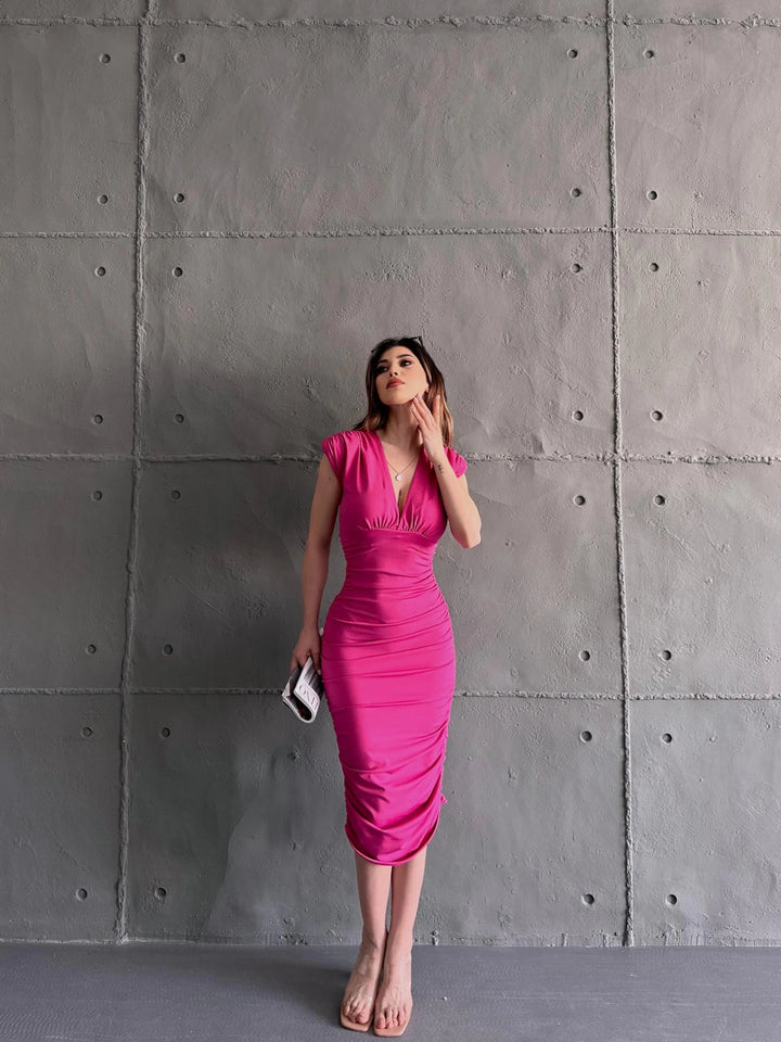 Yanı Büzgü Detaylı Dekolteli Maxi Boy Dalgıç Elbise